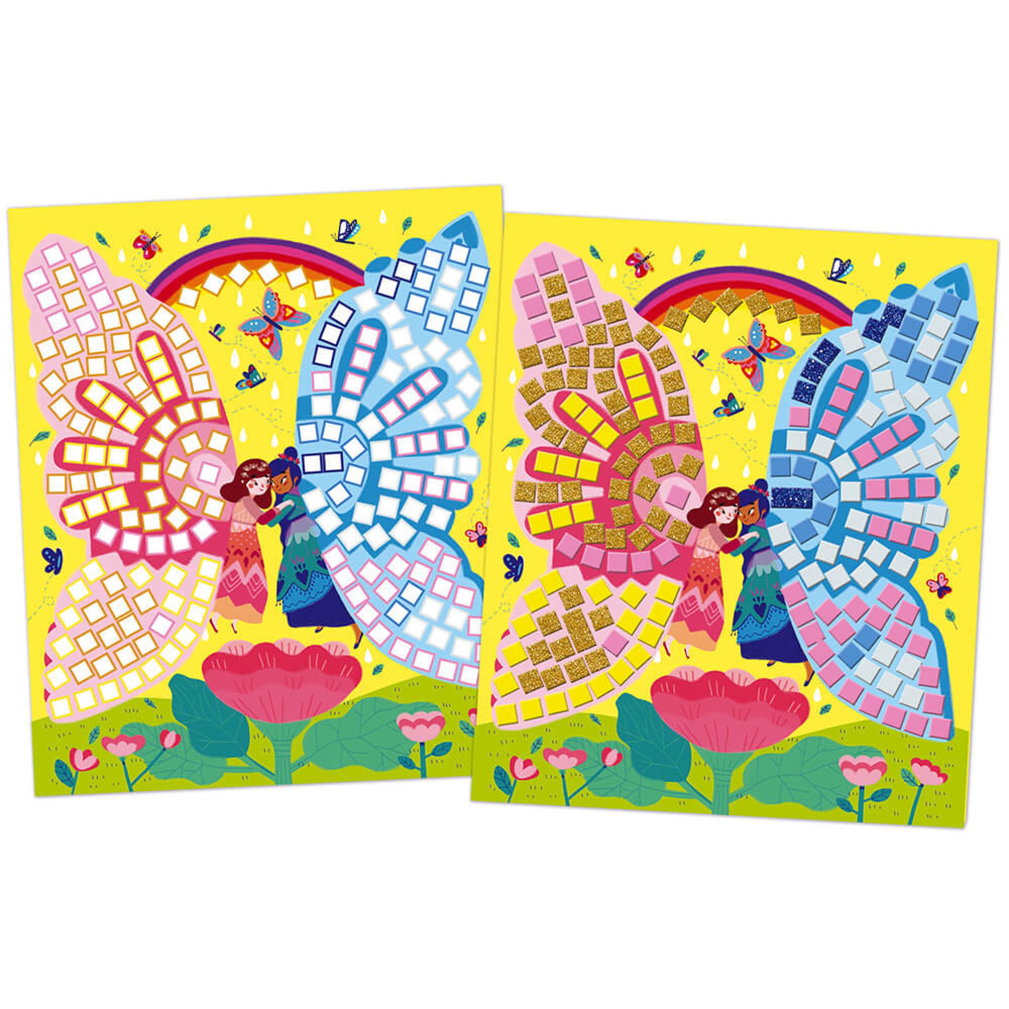 Ce kit créatif est composé de 5 tableaux à réaliser, 1100 mosaïques en mousse et 5 crochets adhésifs. La taille des mosaïques est parfaitement adaptée aux mains des enfants pour bien développer le côté minutieux.