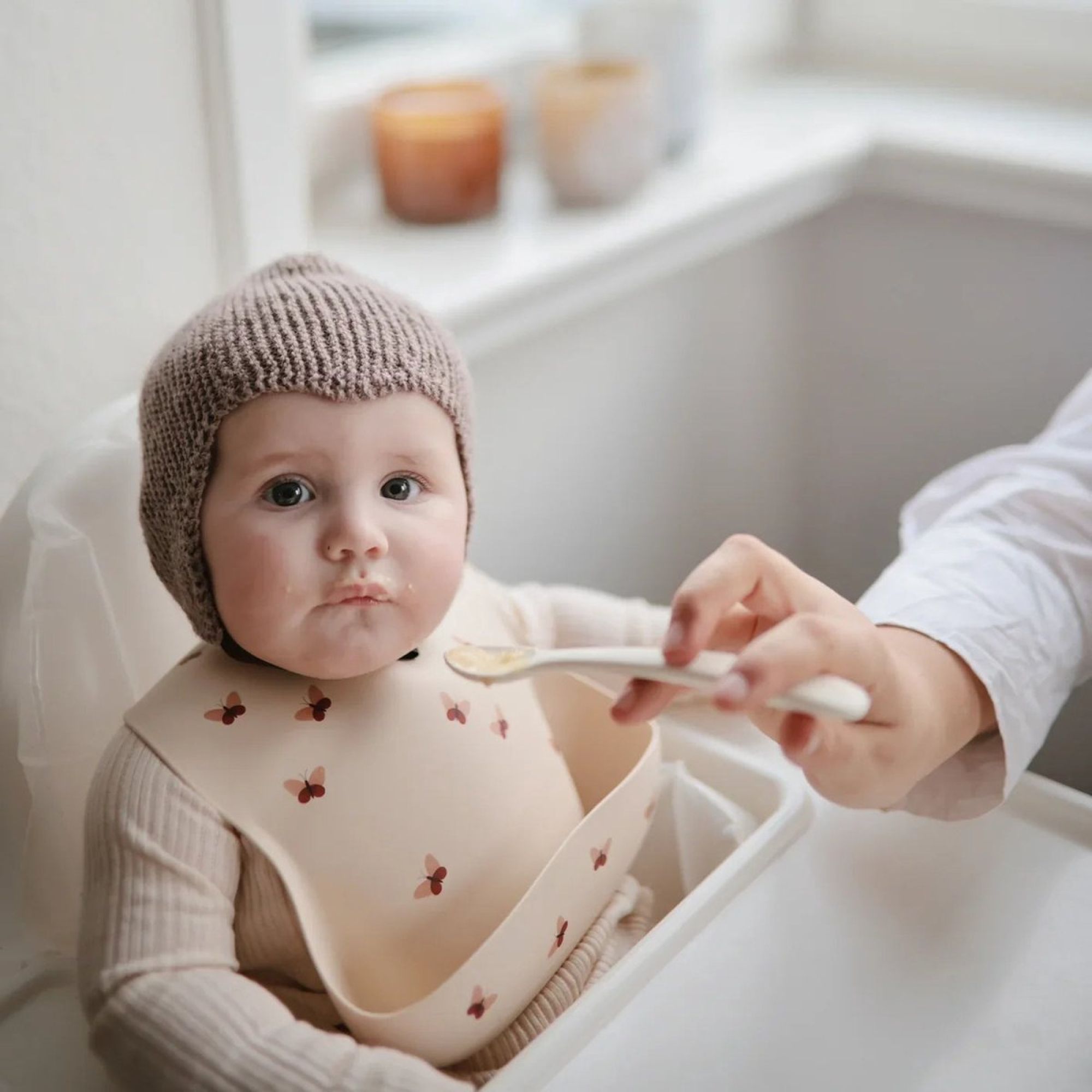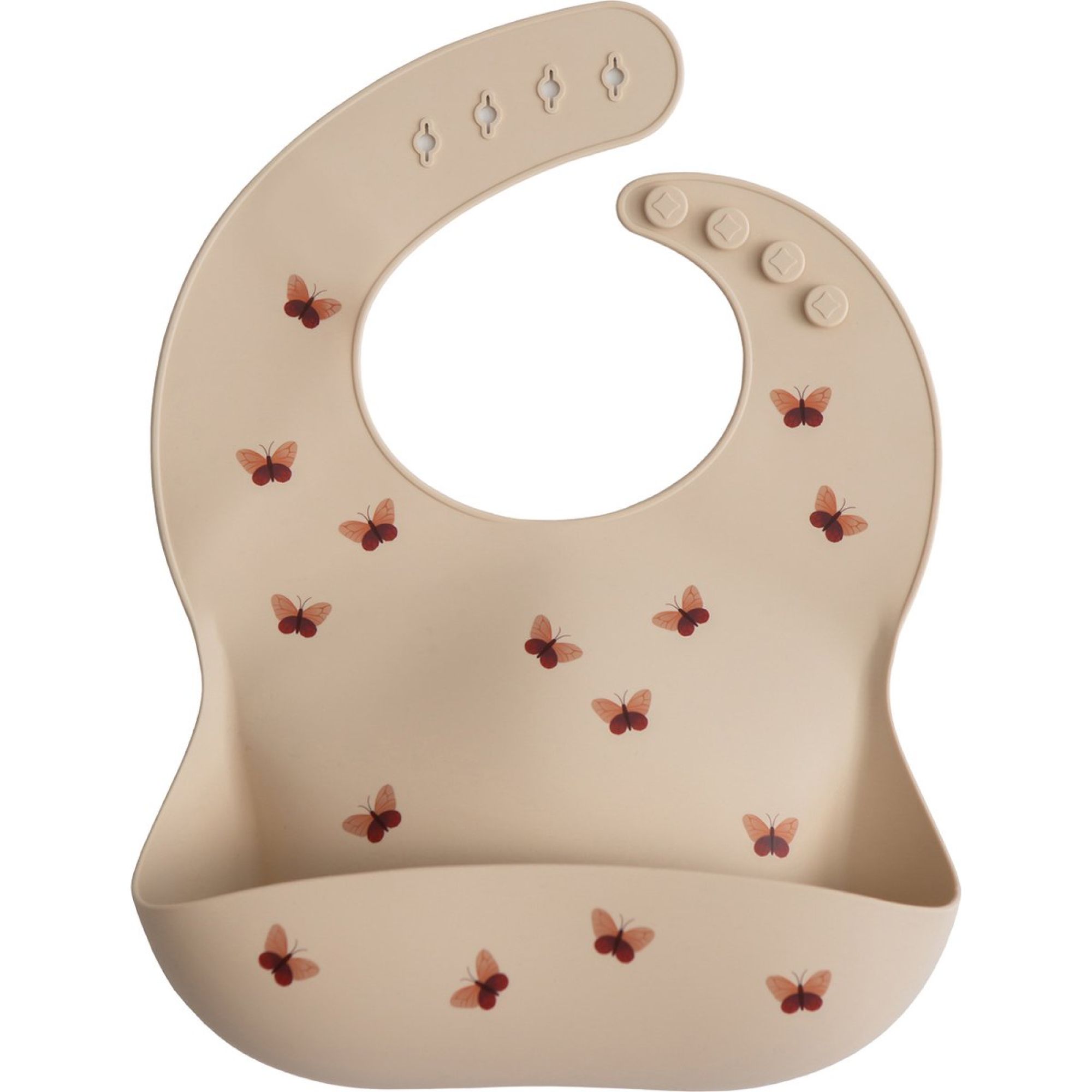Adoptez le bavoir en silicone - Butterflies de la marque mushie. Idéal pour que votre petit ne tache pas ses jolies vêtements. Un indispensable du quotidien pour des repas propre et avec style.