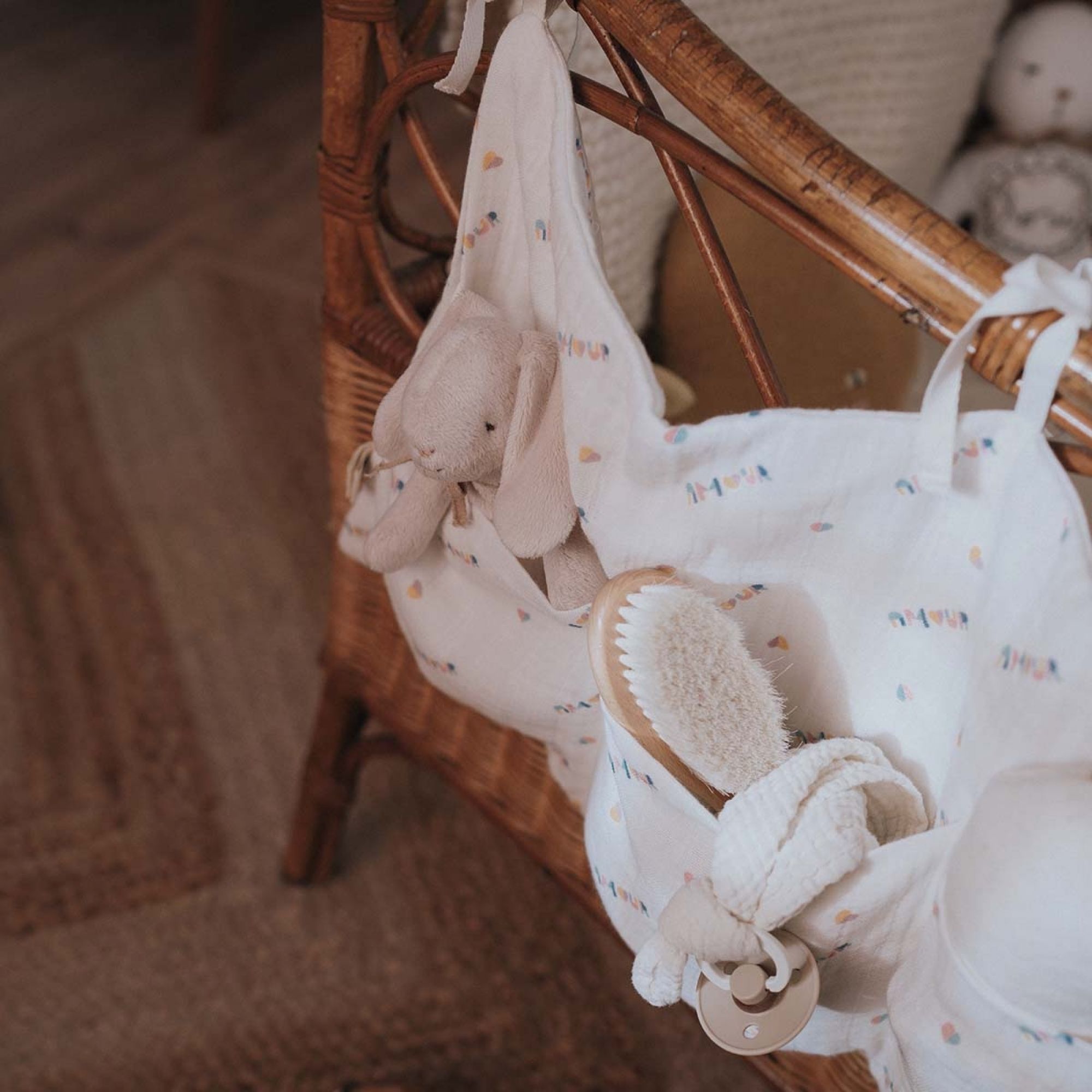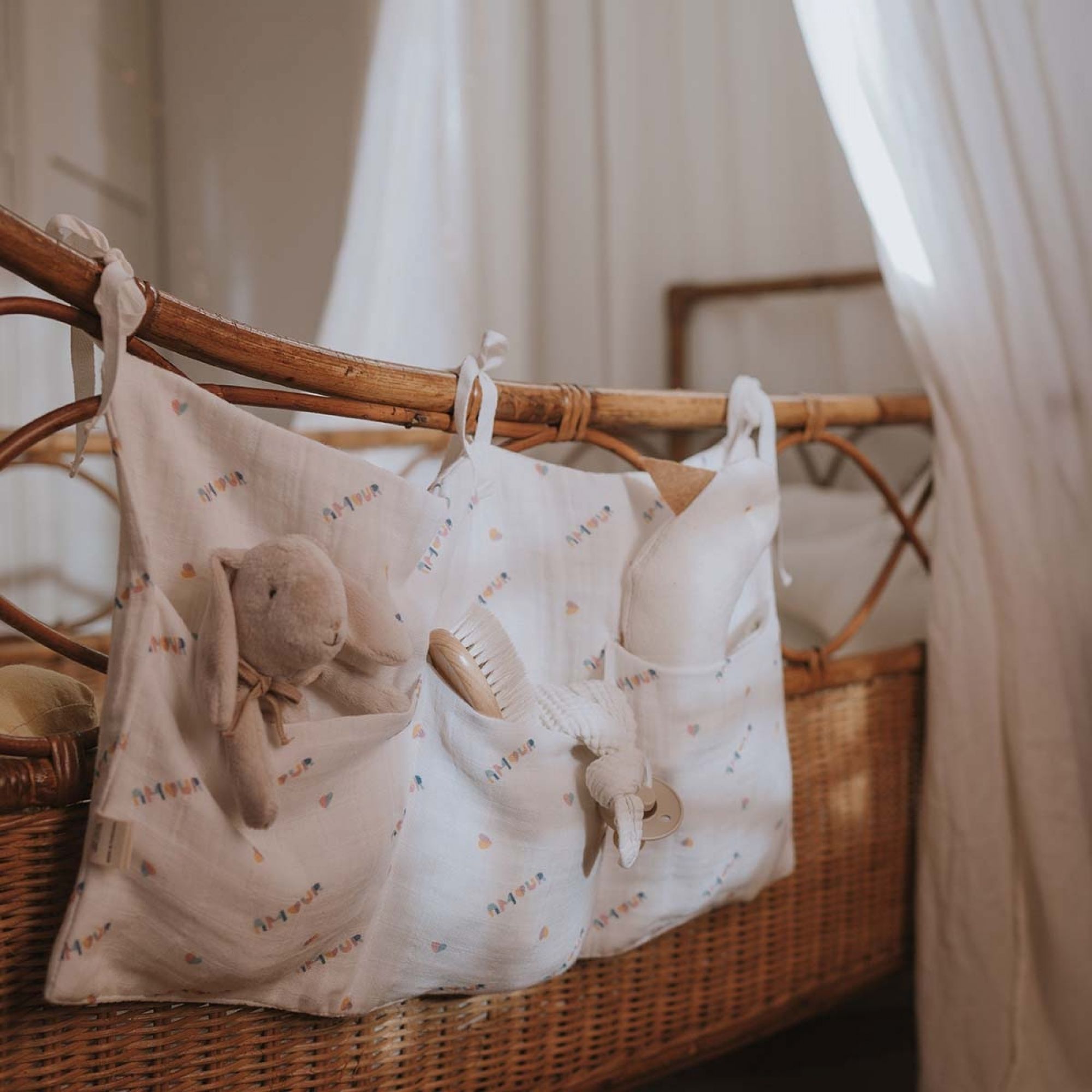 Découvrez pour la pochette de lit Amour de la collection Mathilde de la marque Rose in April. Cette pochette sera idéale pour l'accrocher sur le lit de votre enfant et ranger tous vos essentiels ! Sucette, lange, hochet... Cette pochette vous sera très pratique.