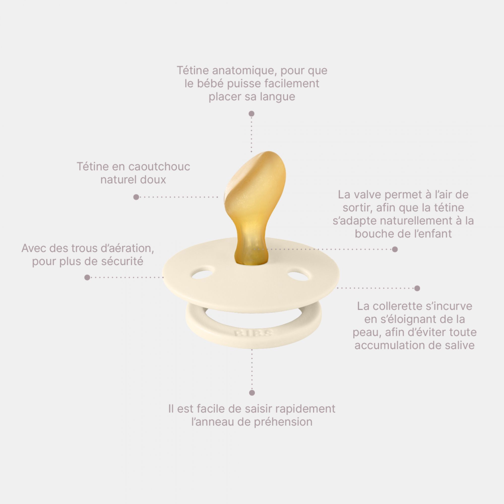 Bibs est une marque danoise fondée en 1978 qui propose des produits haut de gamme. Sucettes Bibs, attache-sucettes, bavoirs bébé, anneaux de dentitions, langes bébé et aussi biberons. Des produits originaux, sûrs et esthétiques, fabriqués de manière durable ! Les sucettes Bibs sont conçues en latex de caoutchouc naturel ou en silicone. Le caoutchouc naturel est un matériau doux, élastique et résilient. Le silicone quant à lui est hypoallergénique, inodore et neutre au goût. L'embout rond des tétines Bibs imite la forme et la taille du mamelon afin d'être acceptées plus facilement par votre enfant.