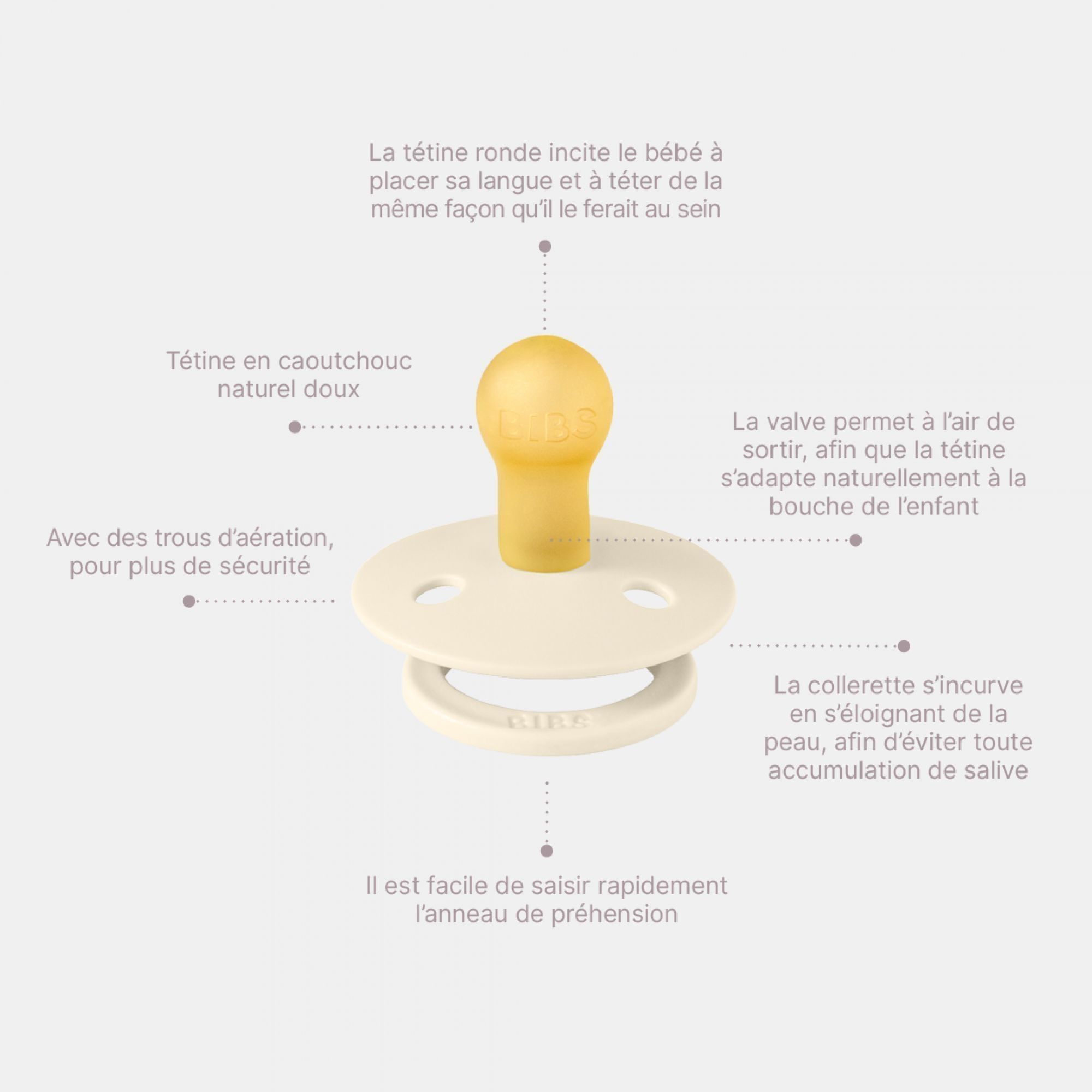 Bibs est une marque danoise fondée en 1978 qui propose des produits haut de gamme. Sucettes Bibs, attache-sucettes, bavoirs bébé, anneaux de dentitions, langes bébé et aussi biberons. Des produits originaux, sûrs et esthétiques, fabriqués de manière durable ! Les sucettes Bibs sont conçues en latex de caoutchouc naturel ou en silicone. Le caoutchouc naturel est un matériau doux, élastique et résilient. Le silicone quant à lui est hypoallergénique, inodore et neutre au goût. L'embout rond des tétines Bibs imite la forme et la taille du mamelon afin d'être acceptées plus facilement par votre enfant.