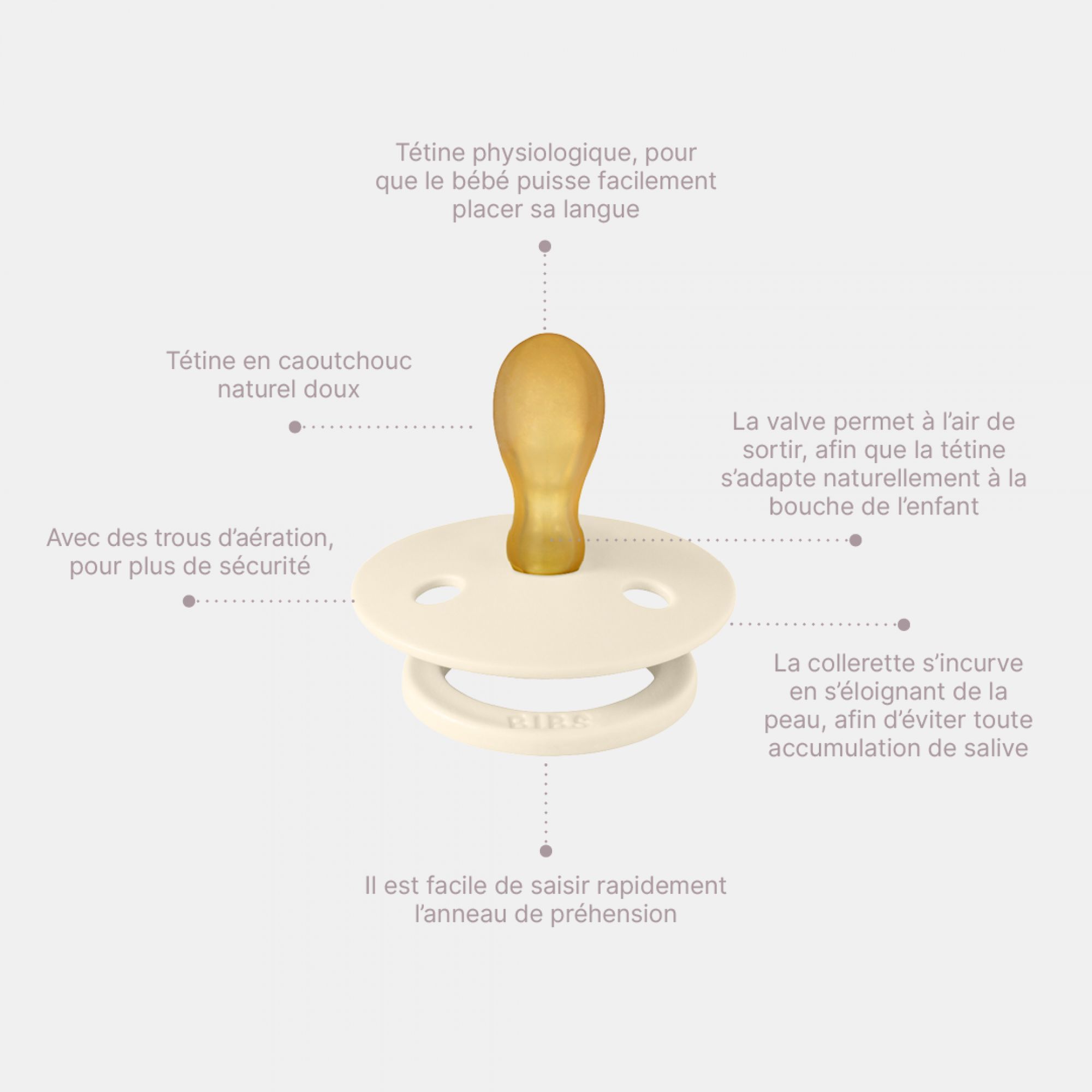 Bibs est une marque danoise fondée en 1978 qui propose des produits haut de gamme. Sucettes Bibs, attache-sucettes, bavoirs bébé, anneaux de dentitions, langes bébé et aussi biberons. Des produits originaux, sûrs et esthétiques, fabriqués de manière durable ! Les sucettes Bibs sont conçues en latex de caoutchouc naturel ou en silicone. Le caoutchouc naturel est un matériau doux, élastique et résilient. Le silicone quant à lui est hypoallergénique, inodore et neutre au goût. L'embout rond des tétines Bibs imite la forme et la taille du mamelon afin d'être acceptées plus facilement par votre enfant.