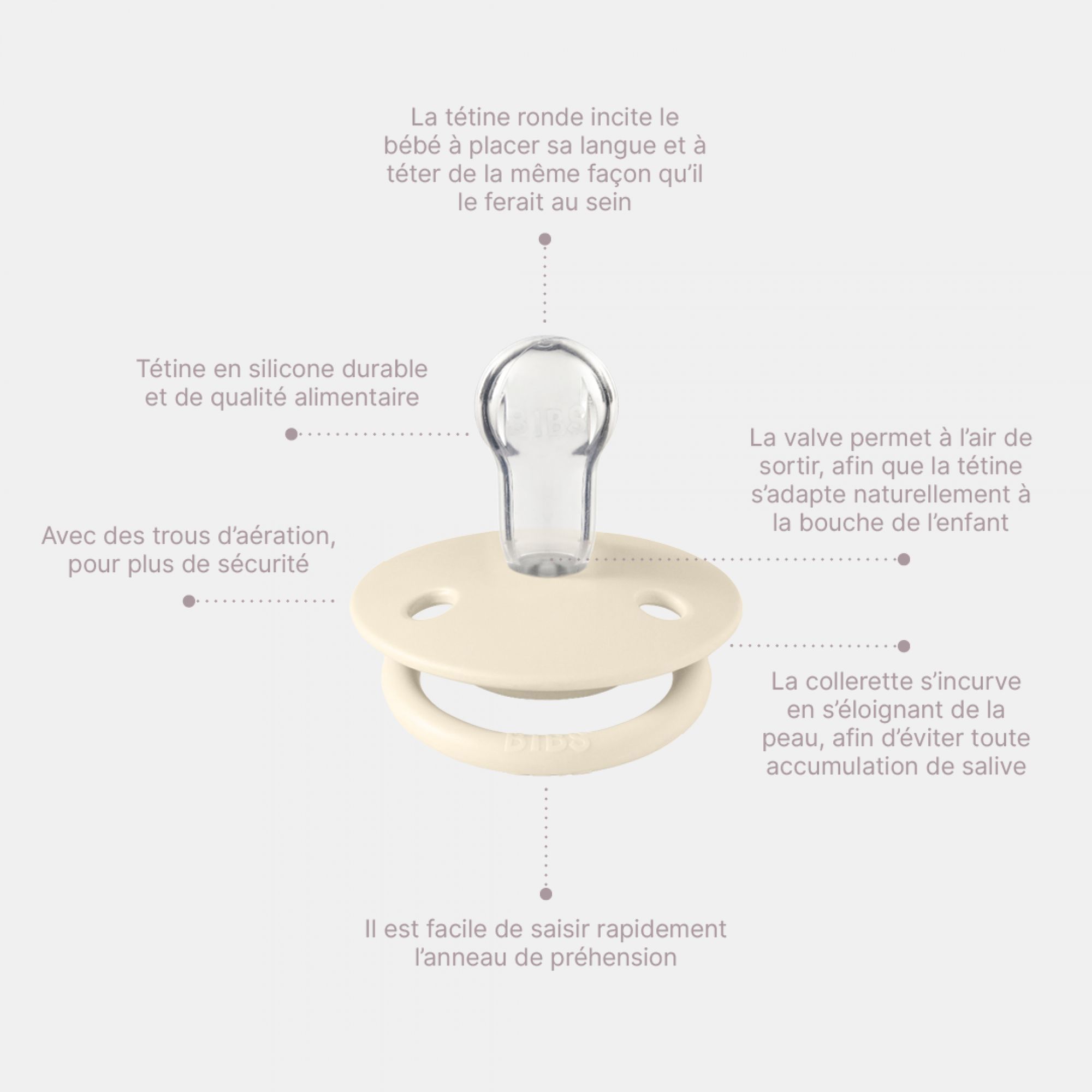 Bibs est une marque danoise fondée en 1978 qui propose des produits haut de gamme. Sucettes Bibs, attache-sucettes, bavoirs bébé, anneaux de dentitions, langes bébé et aussi biberons. Des produits originaux, sûrs et esthétiques, fabriqués de manière durable ! Les sucettes Bibs sont conçues en latex de caoutchouc naturel ou en silicone. Le caoutchouc naturel est un matériau doux, élastique et résilient. Le silicone quant à lui est hypoallergénique, inodore et neutre au goût. L'embout rond des tétines Bibs imite la forme et la taille du mamelon afin d'être acceptées plus facilement par votre enfant.