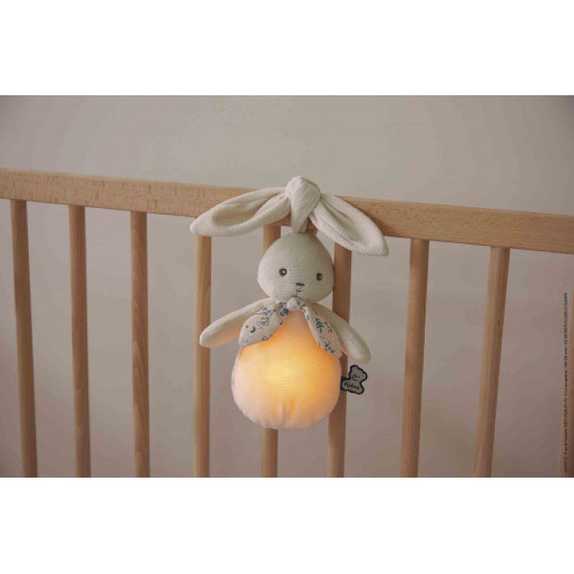 Les grandes oreilles permettront à votre enfant d'attraper facilement le lapin ou vous permettront de le nouer aux barreaux du lit. Il suffira d'une simple pression sur le ventre du Lapinoo pour allumer ou éteindre la veilleuse.