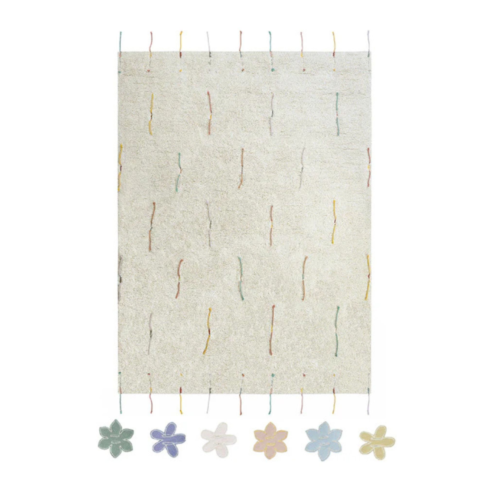 Le tapis Wildflowers est livré avec 14 fleurs faites à la main en coton, aux formes et couleurs variées, que les enfants peuvent fixer et repositionner à l’infini. Les franges du tapis sont également constituées de cordons colorés, pour une finition pleine de gaieté. Une pièce à la fois décorative, interactive et sensorielle, qui encourage l’autonomie et l’imaginaire des tout-petits.