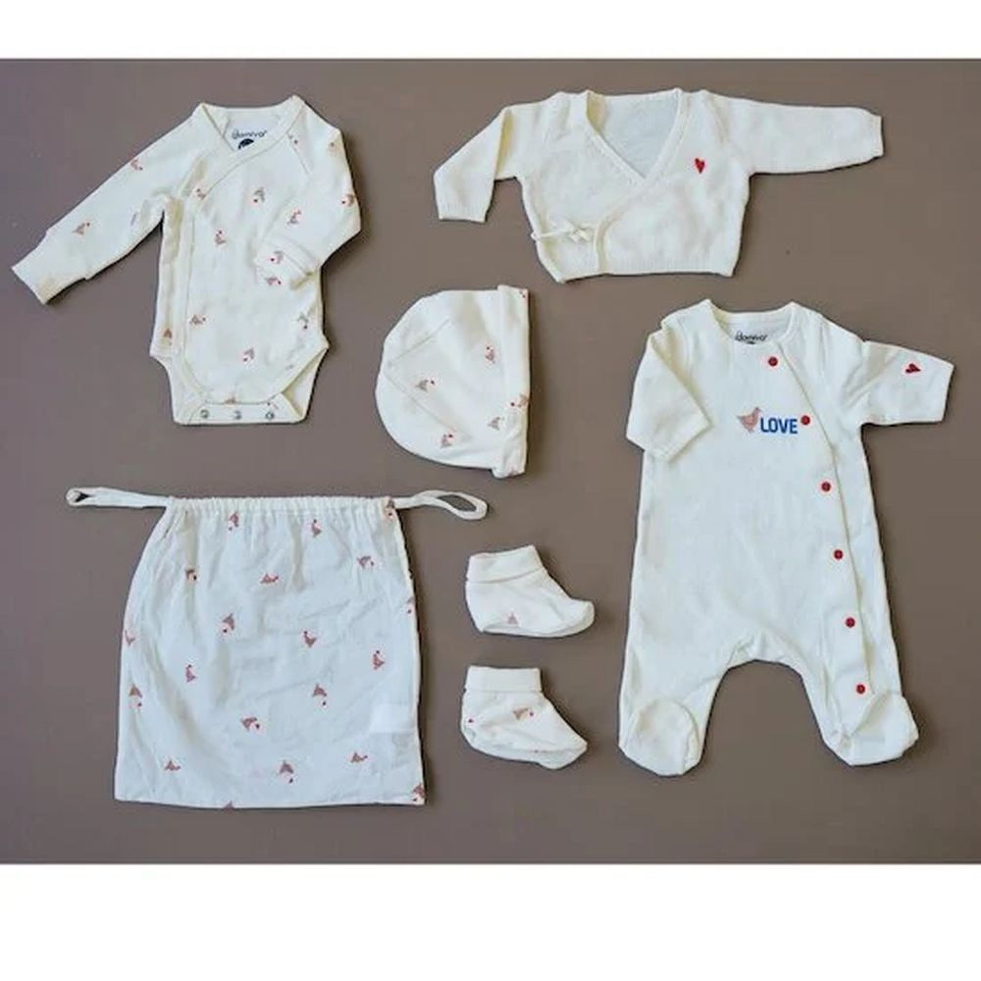 Découvrez ce kit naissance 6 pièces de couleur beige collection maternity love de la marque Domiva . Il a été spécialement conçu pour les bébés dès la naissance. Ce kit vêtement naissance comprend 1 body, 1 pyjama en molleton, 1 cardigan en coton, 1 bonnet et des chaussons. C'est le cadeau idéal pour la venu d'un petit bout !
