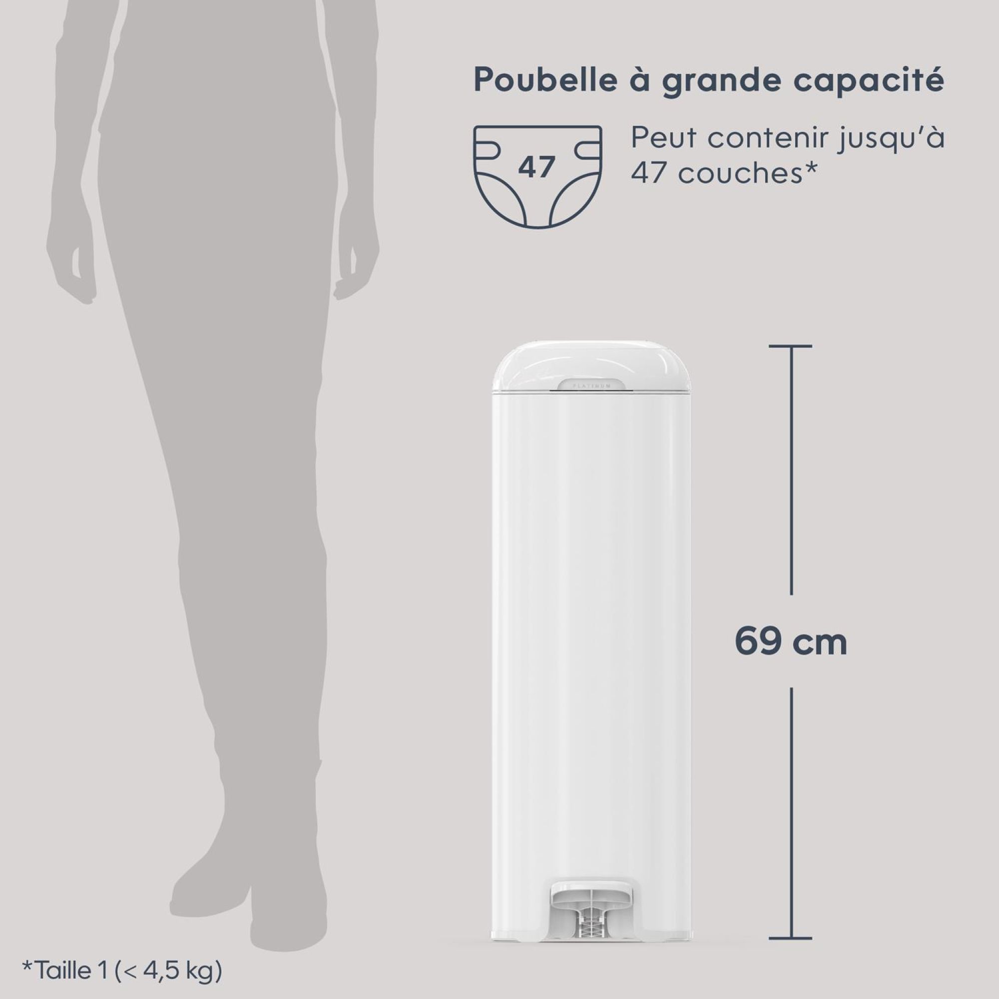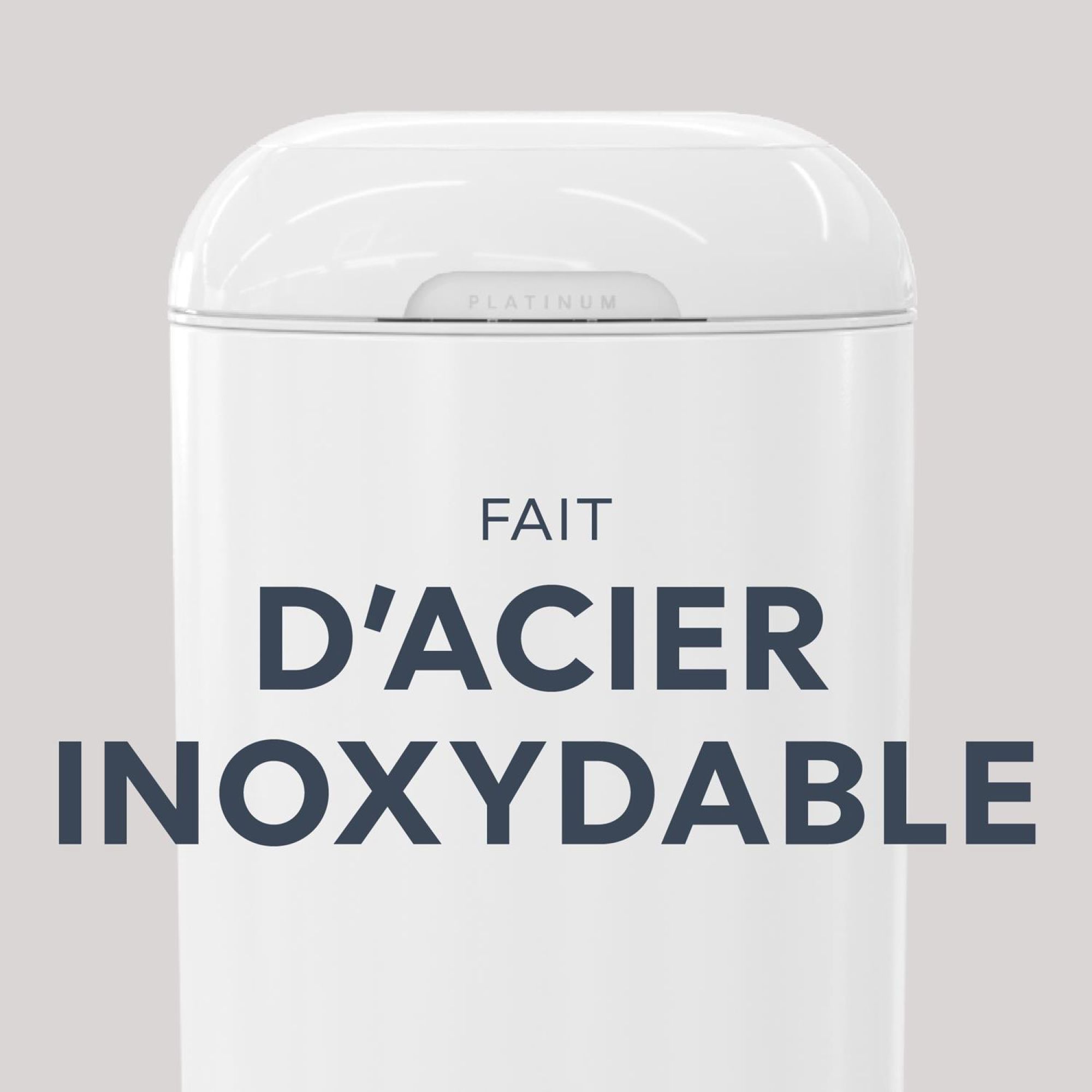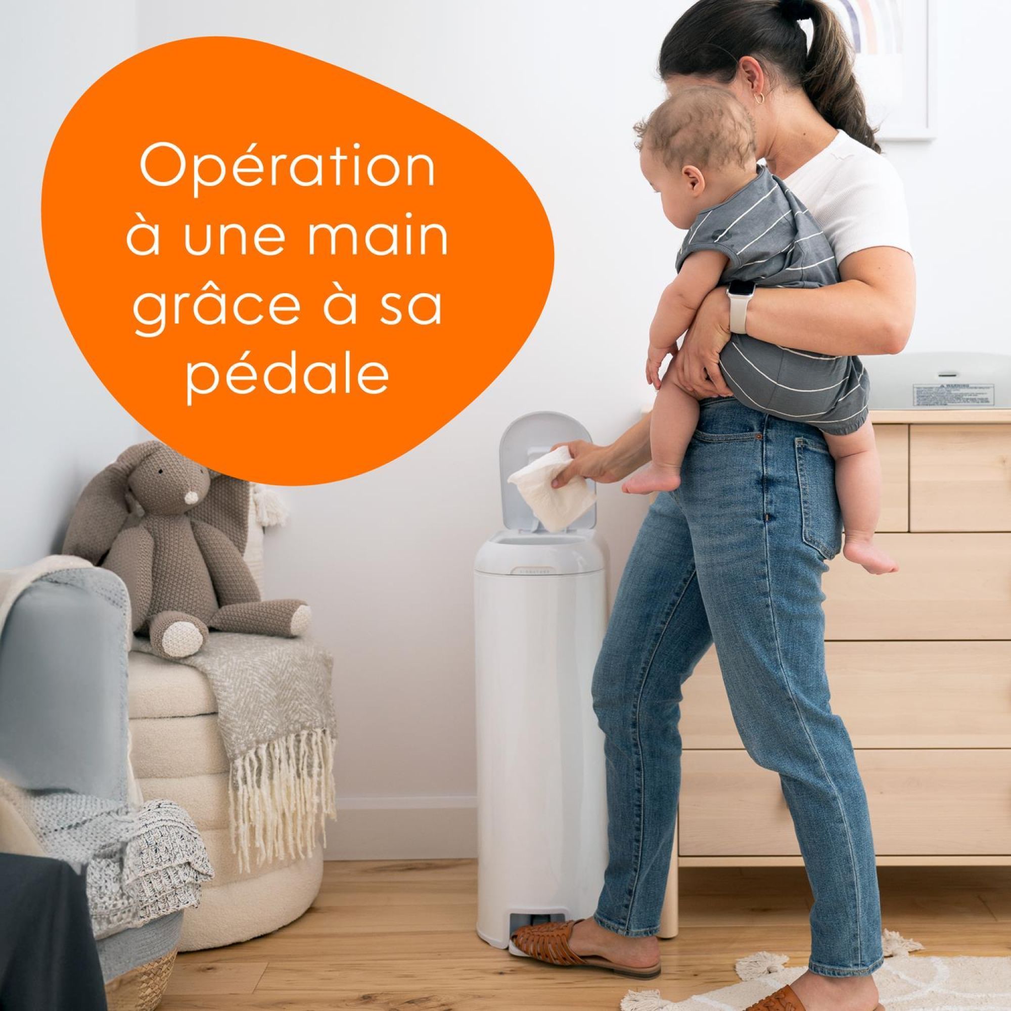 Découvrez la poubelle à couches Platinum avec 1 recharge Easy Roll 18 sacs de la marque Diaper Genie. La poubelle platinum es conçue pour un contrôle des odeurs maximal, une grande capacité et une utilisation pratique et hygiénique. Elle est fabriquée en acier inoxydable durable, ce qui la rend robuste et lui confère une apparence moderne et élégante pour la chambre de bébé. La poubelle est équipée de pinces bloque-odeur qui aident à empêcher les mauvaises odeurs de s'échapper, agissant comme un double verrouillage en complément du film multi-épaisseurs des sacs. Grâce à sa pédale, vous pouvez ouvrir le couvercle et jeter la couche sans utiliser vos mains, pour une hygiène maximale. Le couvercle se referme doucement, réduisant le bruit dans la nurserie, surtout lorsque bébé dort. Elle peut contenir jusqu'à 47 couches de taille nouveau-né (ou environ 50 couches de taille 1), réduisant la fréquence de changement des sacs.