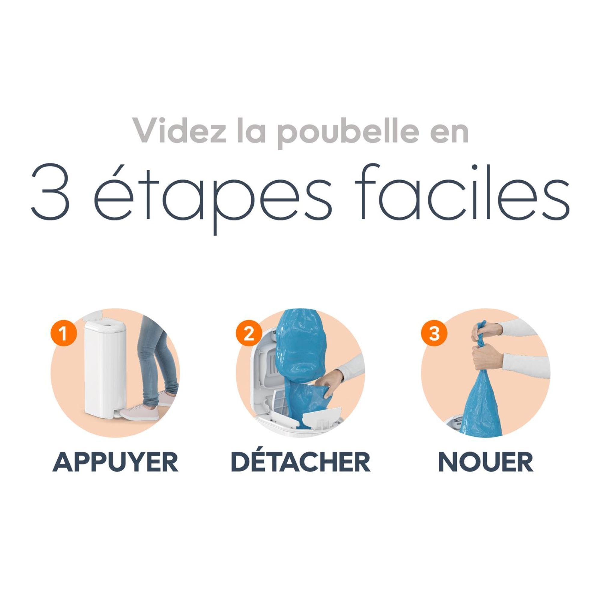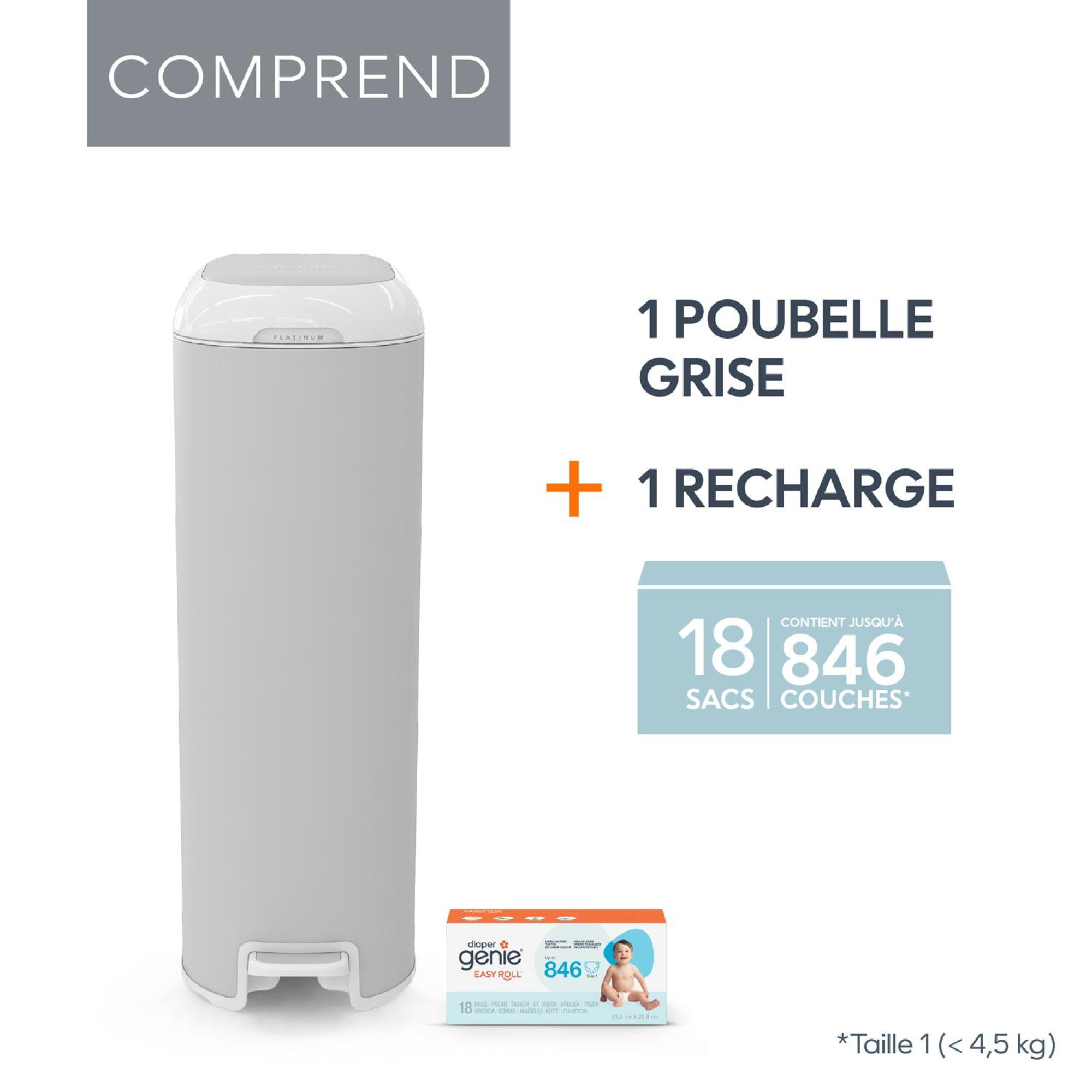La poubelle est livrée avec une recharge Easy Roll 18 sacs, le nouveau format longue durée de Diaper Genie. Une seule recharge Easy Roll (18 sacs) peut durer jusqu'à 5 mois ou contenir jusqu'à 846 couches de taille nouveau-né. Elle est équivalente à environ 3 recharges rondes traditionnelles, ce qui est considéré comme plus écologique (moins de plastique).