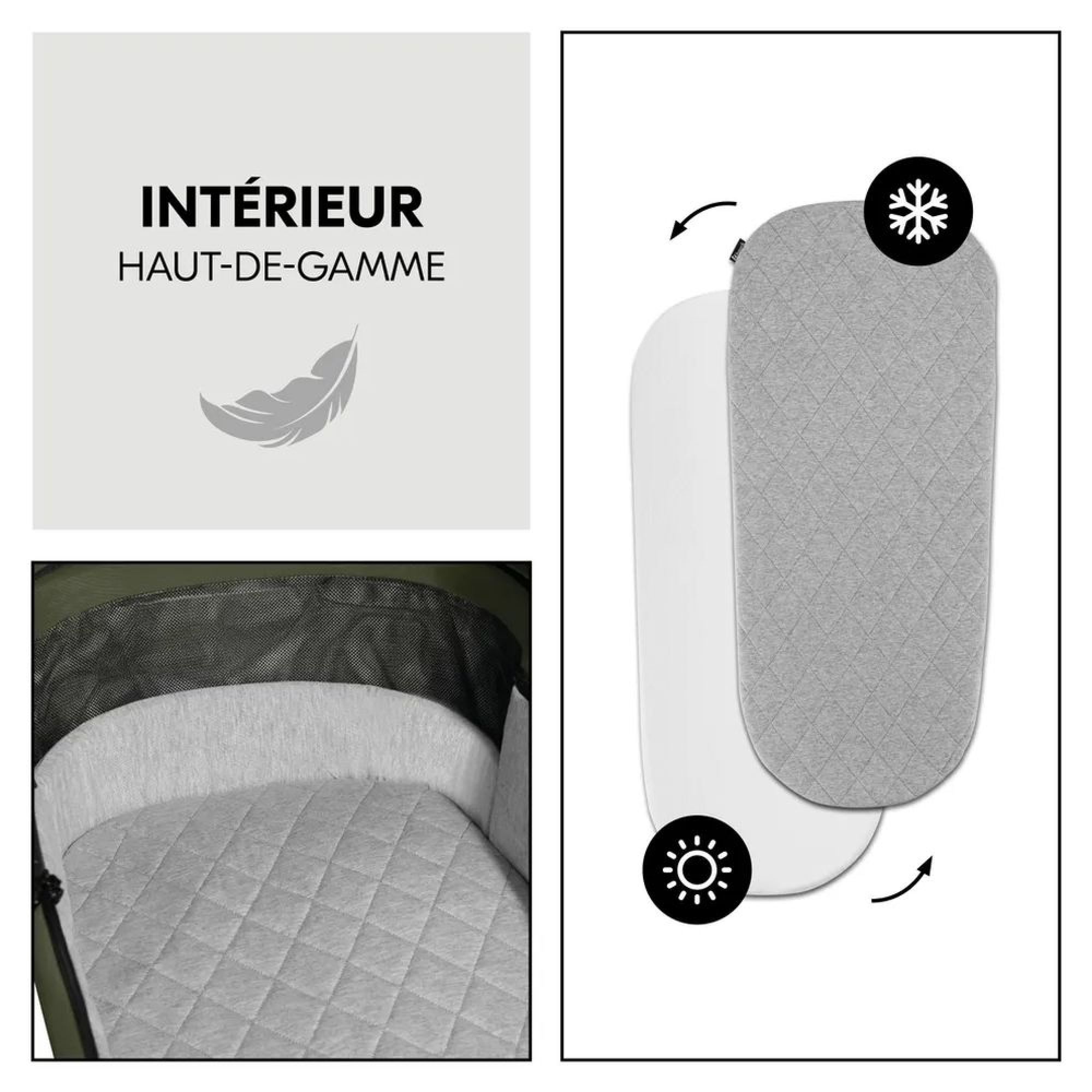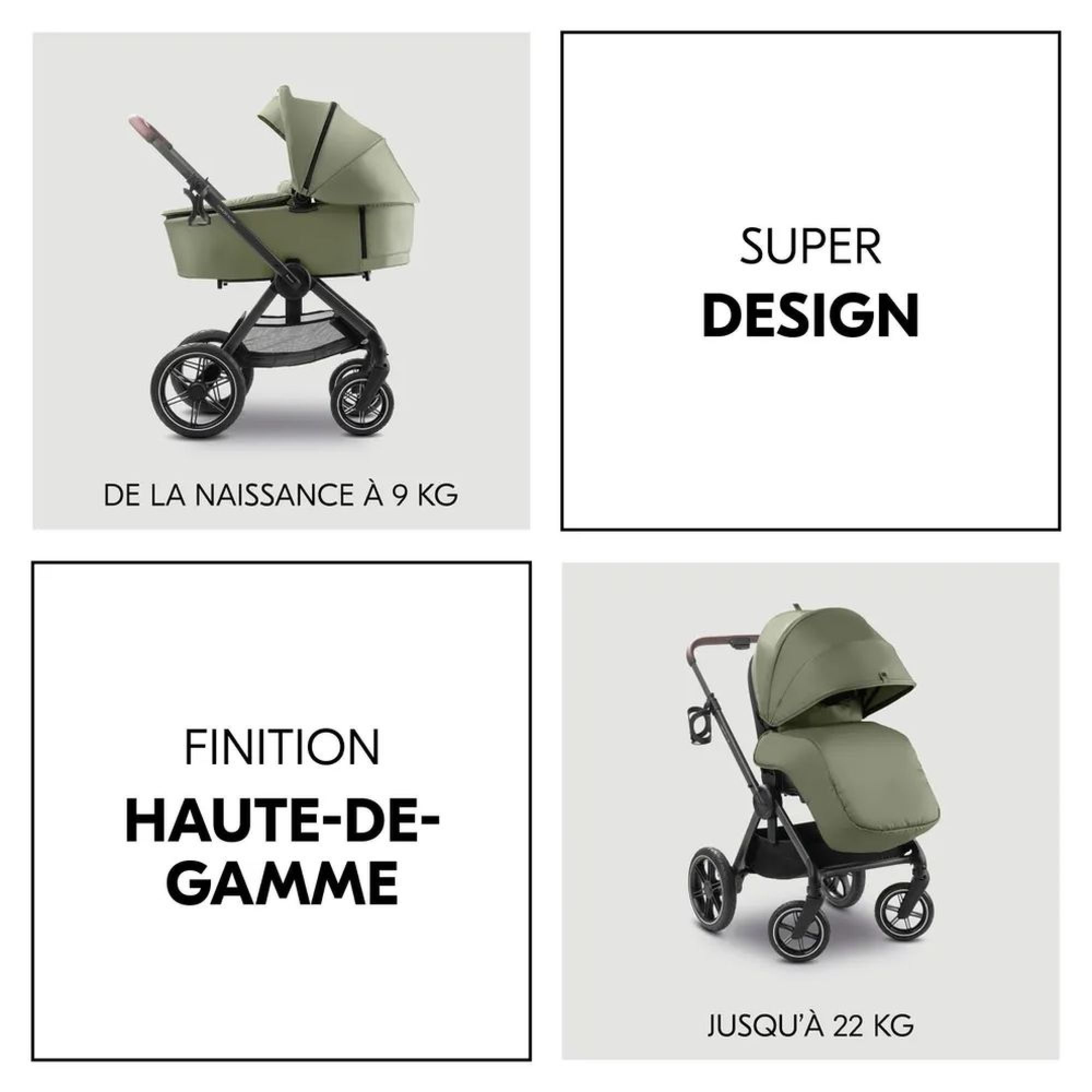 Choisissez le pack poussette Comfort N Care avec nacelle de couleur Olive de la marque Hauck. Ce set comprend une nacelle confortable et utilisable avec la nacelle ou en poussette et vous permet de débuter avec les éléments nécessaires pour l'arrivée de votre bébé à la maison. Avec son superbe design et sa qualité de matériaux et fintion , ce pack premium accompagnera durablement votre enfant , de la naissance à 22 kg . Grâce aux pneus en caoutchouc tout-terrain,la quadruple suspension et le harnais 5 points offre confort quelles que soient les conditions . Le pare-soleil XL extensible (UPF 50+) protège bébé et les fenêtres en filet assurent la ventilation. Avec un porte-gobelet, et vos affaires tiennent dans le panier ! Clipsez le siège pour bébé sur la poussette avec l’adaptateur fourni. Idéal pour le siège auto Drive N Care hauck et d’autres modèles.