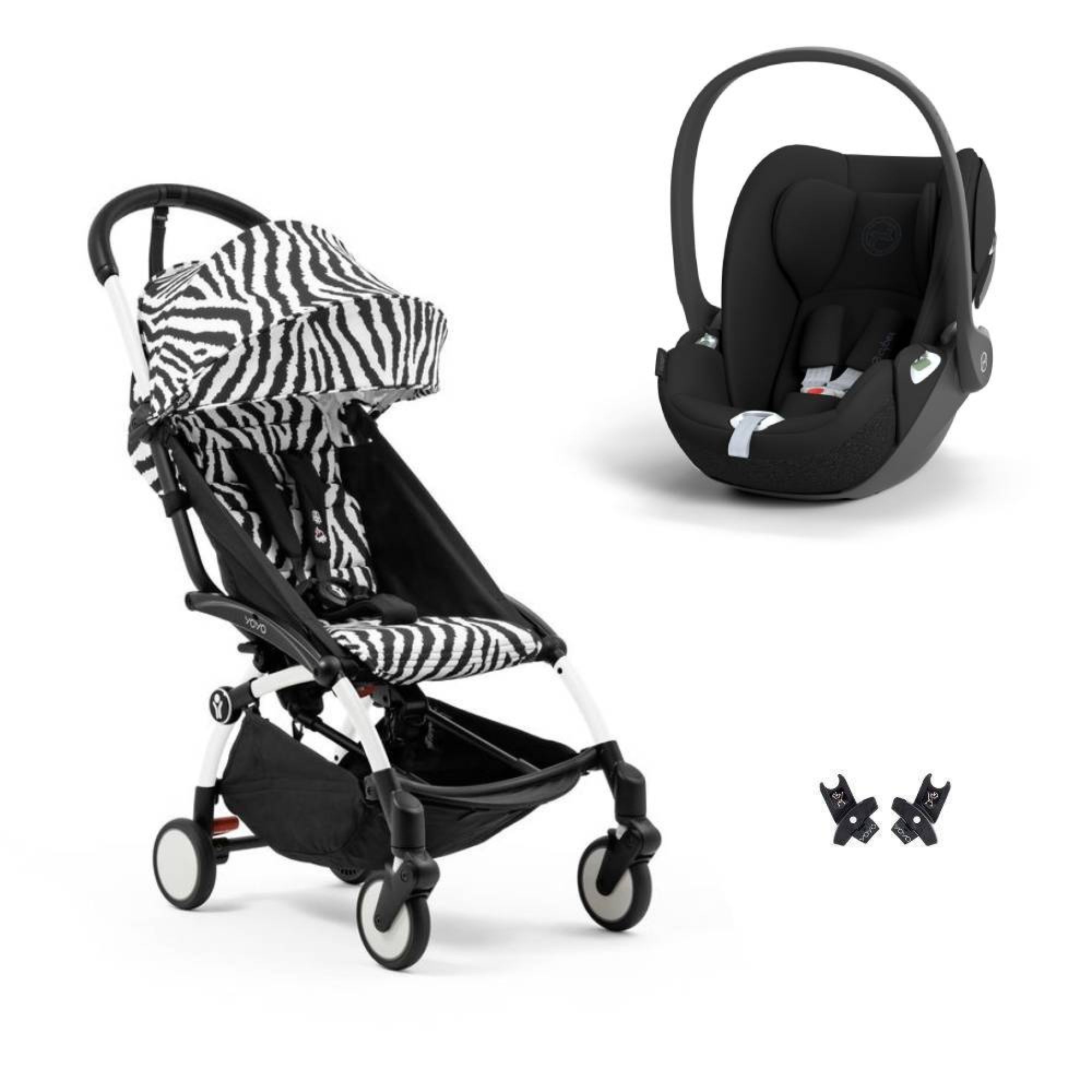 Optez pour la poussette duo YOYO 3 pack 6+ et siège auto Cloud T - Chassis blanc - zebra de la marque Stokke. Ce pack est composé de la poussette YOYO 3 et du siège auto Cloud T. Les adaptateurs sont inclus.