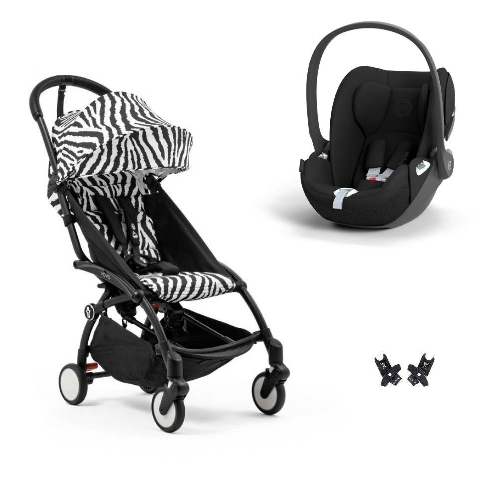 Choisissez la poussette duo YOYO 3 pack 6+ et siège auto Cloud T Black - Chassis noir - Zebra de la marque Stokke. Ce pack est composé de la poussette YOYO 3 et du siège auto Cloud T. Les adaptateurs sont inclus.