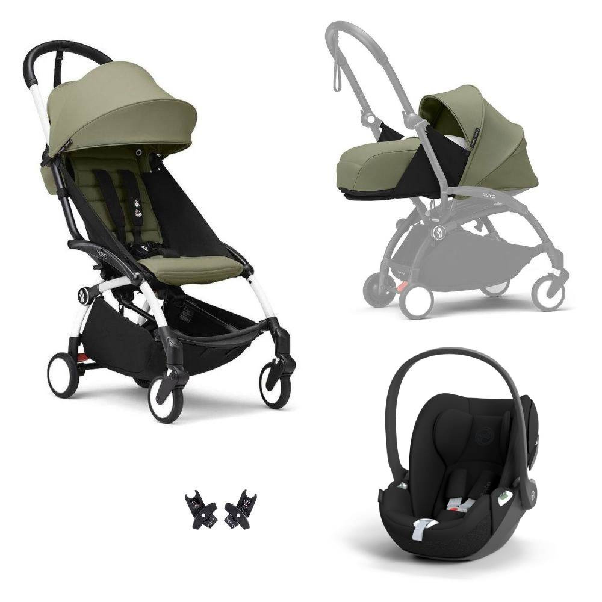 Optez pour la poussette Trio YOYO 3 pack 0+ & 6+ + siège auto Cloud T Black - Châssis blanc - Olive de la marque Stokke. Ce pack est composé de la poussette YOYO 3, du pack nouveau né 0+ et du siège Cloud T. Les adaptateurs sont fournis.
