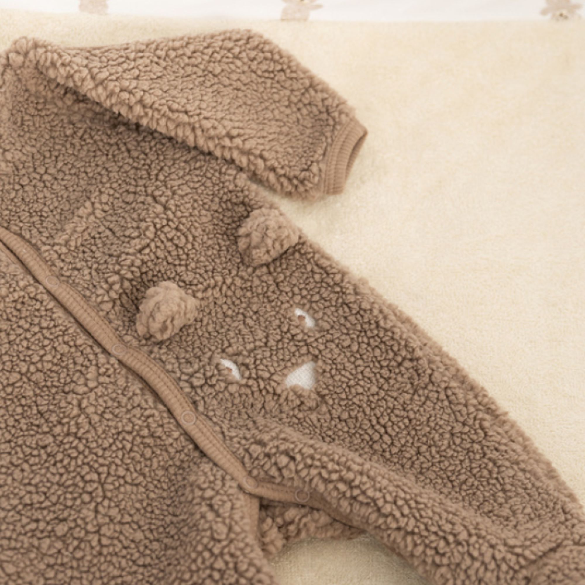 Optez pour ce pyjama bébé 1 mois Bear Chocolate de la marque Pericles. Ce pyjama en tissu teddy enveloppe votre bébé de douceur et de chaleur, pour des journées et des nuits tout confort. Conçu dans une matière moelleuse et respirante, il maintient une température agréable tout en respectant la peau délicate des nouveau-nés. Son design craquant avec de petites oreilles et un visage d’ourson brodé ajoute une touche de tendresse à chaque instant.