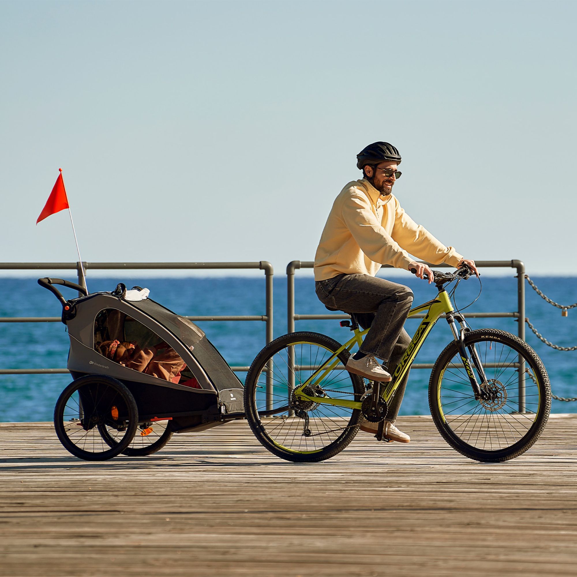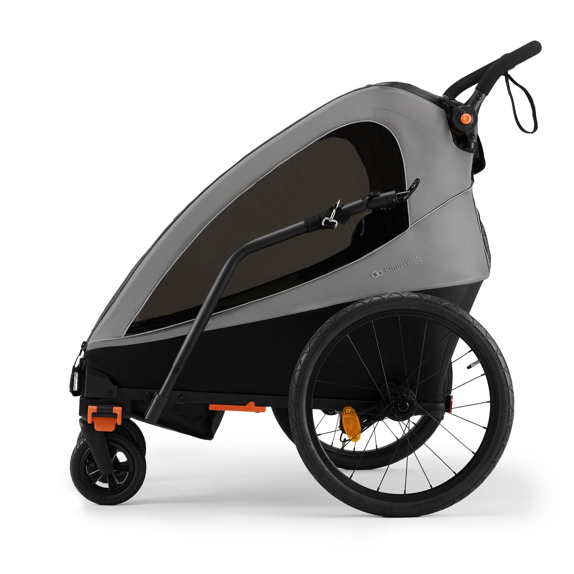 Découvrez la remorque Nava Walk de la marque Kinderkraft. La Nava Walk se concentre sur une double fonctionnalité optimisée en tant que remorque de vélo et poussette de promenade (sans le kit spécifique de roue de jogging fixe). Ce modèle 2-en-1 privilégie la compacité et la simplicité d'utilisation pour les trajets quotidiens, offrant un habitacle sécurisé avec harnais à 5 points et un système de suspension arrière qui garantit un confort stable sur le bitume comme sur les chemins de parc. Son design intelligent permet de ranger le bras de remorquage directement sous le châssis pour transformer la remorque en poussette maniable en quelques secondes, le tout complété par une protection efficace contre les intempéries (fenêtres anti-UV et moustiquaire) et un grand coffre de rangement à l'arrière pour les courses.