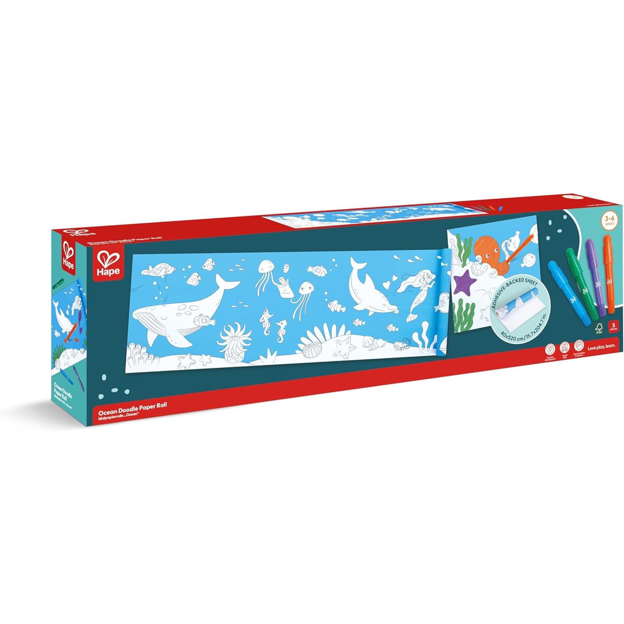 Découvrez le rouleau à dessin enfant avec feutre Océan Hape qui transforme chaque moment de jeu en une véritable aventure artistique. Avec son format de 5 mètres de long, il invite les enfants à explorer les fonds marins et à donner vie à poissons, coraux et créatures aquatiques. Grâce à son dos autocollant repositionnable, le rouleau peut être collé sur un mur, un meuble ou le sol sans laisser de traces, pour créer un espace d’expression libre. Les lignes de déchirure prédécoupées tous les 40 cm permettent de détacher facilement des morceaux à emporter ou à afficher. Le kit inclut 4 crayons de cire colorés pour un coloriage simple et sans effort. Une activité artistique et sensorielle idéale pour développer la motricité fine, la concentration et l’imagination des enfants.