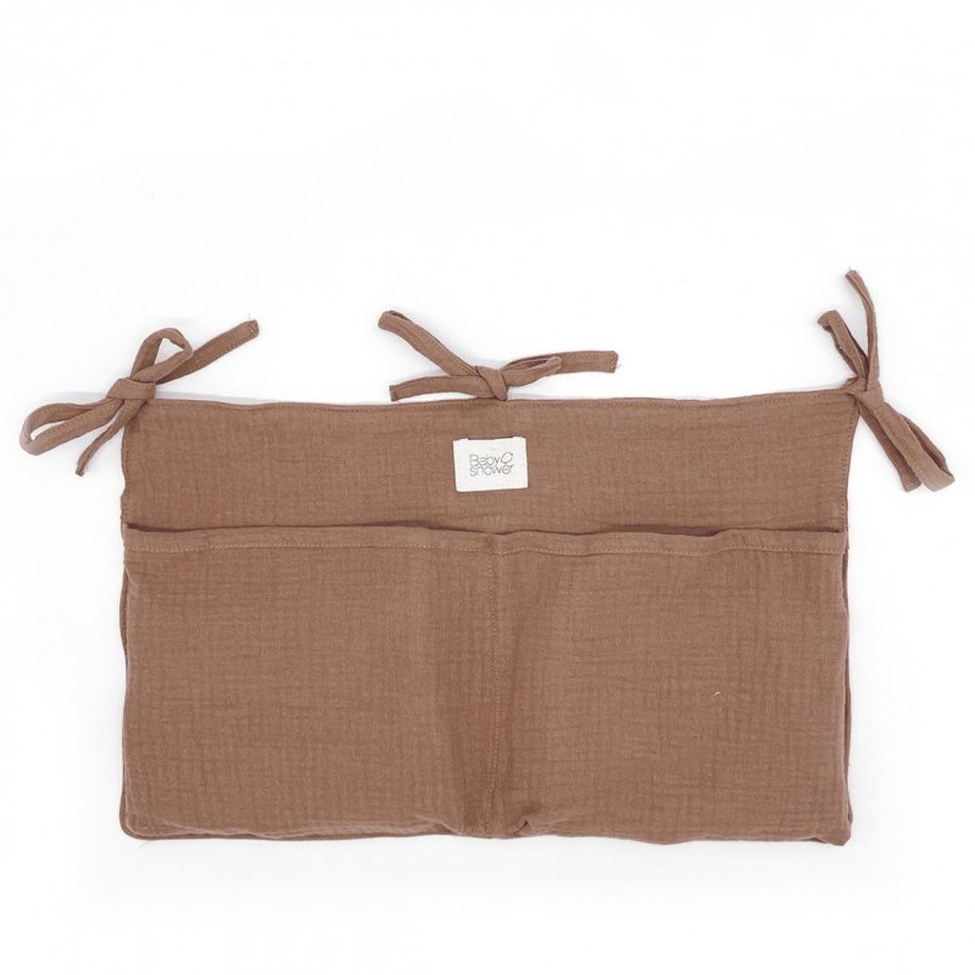Optez pour le sac de rangement Caramel glacé de la marque BabyShower. Cette poche de rangement pratique et simple pour attacher aux barreaux du lit du bébé et ranger les petits accessoires tel que tétines, bavoir, biberon d'eau... Fabriqué 100% coton bio avec deux poches frontales.