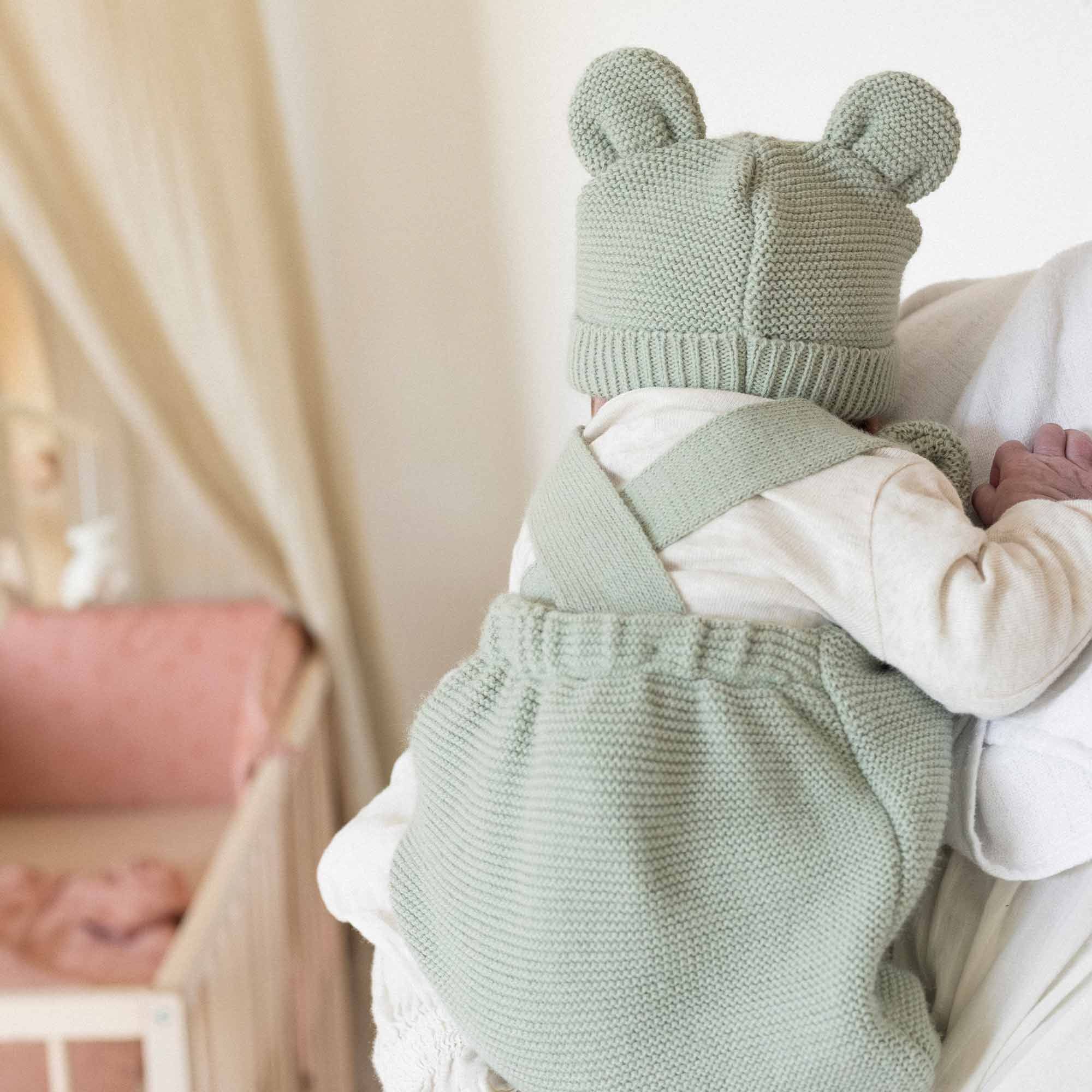 La salopette est tricotée en maille fine et possiède un style intemporel, raffiné et mixte, ce qui en fait un très beau cadeau de naissance.