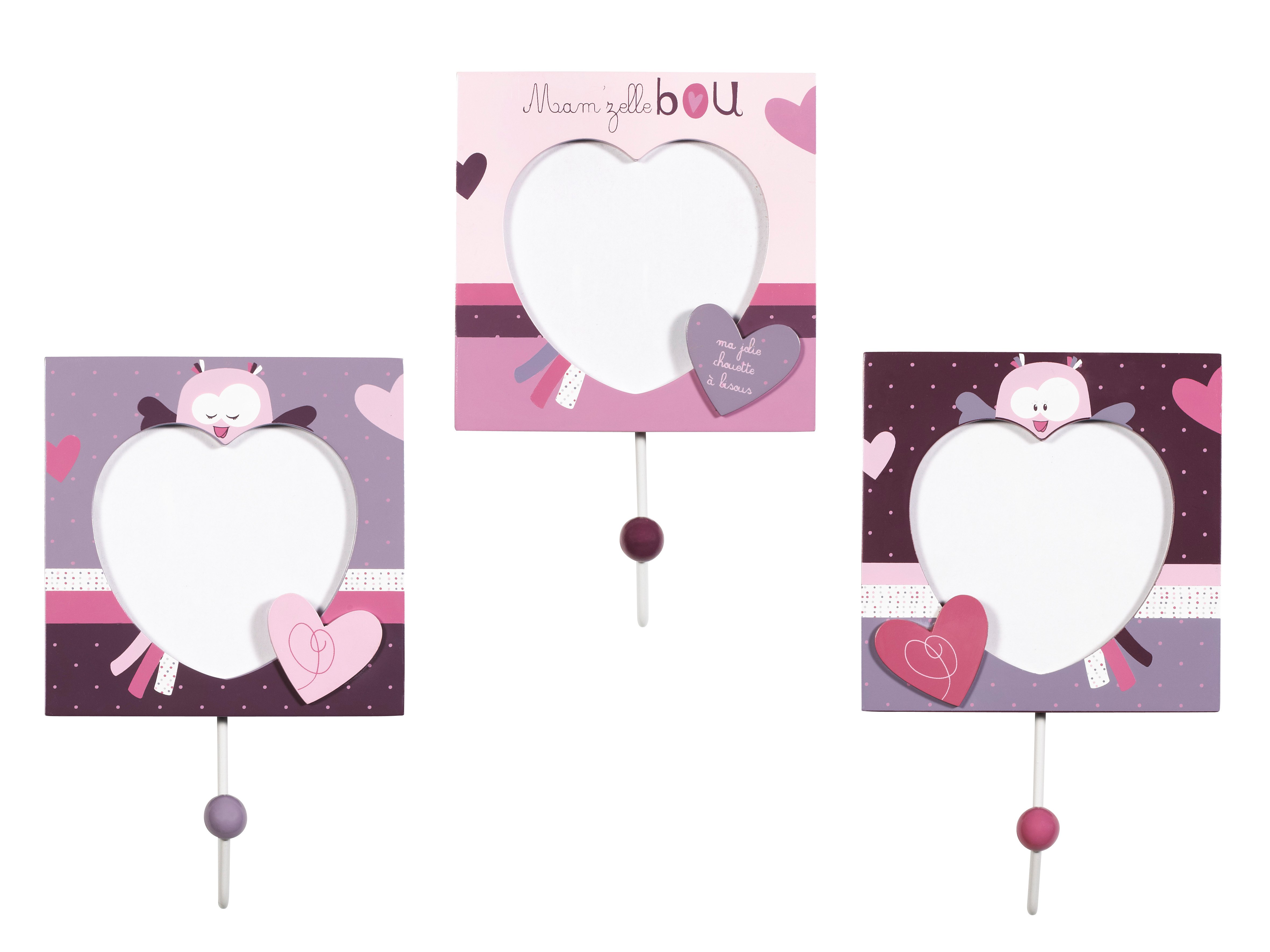 Découvrez ce lot de 3 patères de la collection Mam'zelle Bou de la marque Sauthon Baby Déco. Ces adorables porte-manteaux s'accroche directement au mur. Votre petit bout pourra suspendre ses affaires les plus précieuses et même insérer des photos ou images.