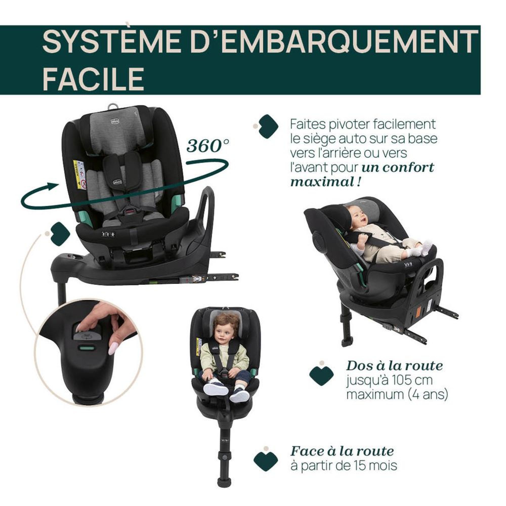 Découvrez le siège auto FullSeat 360 i-Size avec base de la marque Chicco. Le FullSeat 360 i-Size se présente comme une solution de transport unique et durable, conçue pour accompagner la croissance de votre enfant de la naissance jusqu'à ses 12 ans environ. Ce siège auto "tout-en-un" mise avant tout sur le confort et la praticité quotidienne grâce à son système de rotation à 360°, qui permet de positionner l'assise face à la portière pour installer ou sortir l'enfant sans effort. Alliant élégance et ergonomie, il offre un environnement sécurisant et évolutif, évitant ainsi aux parents de devoir investir dans plusieurs dispositifs de retenue au fil des années.