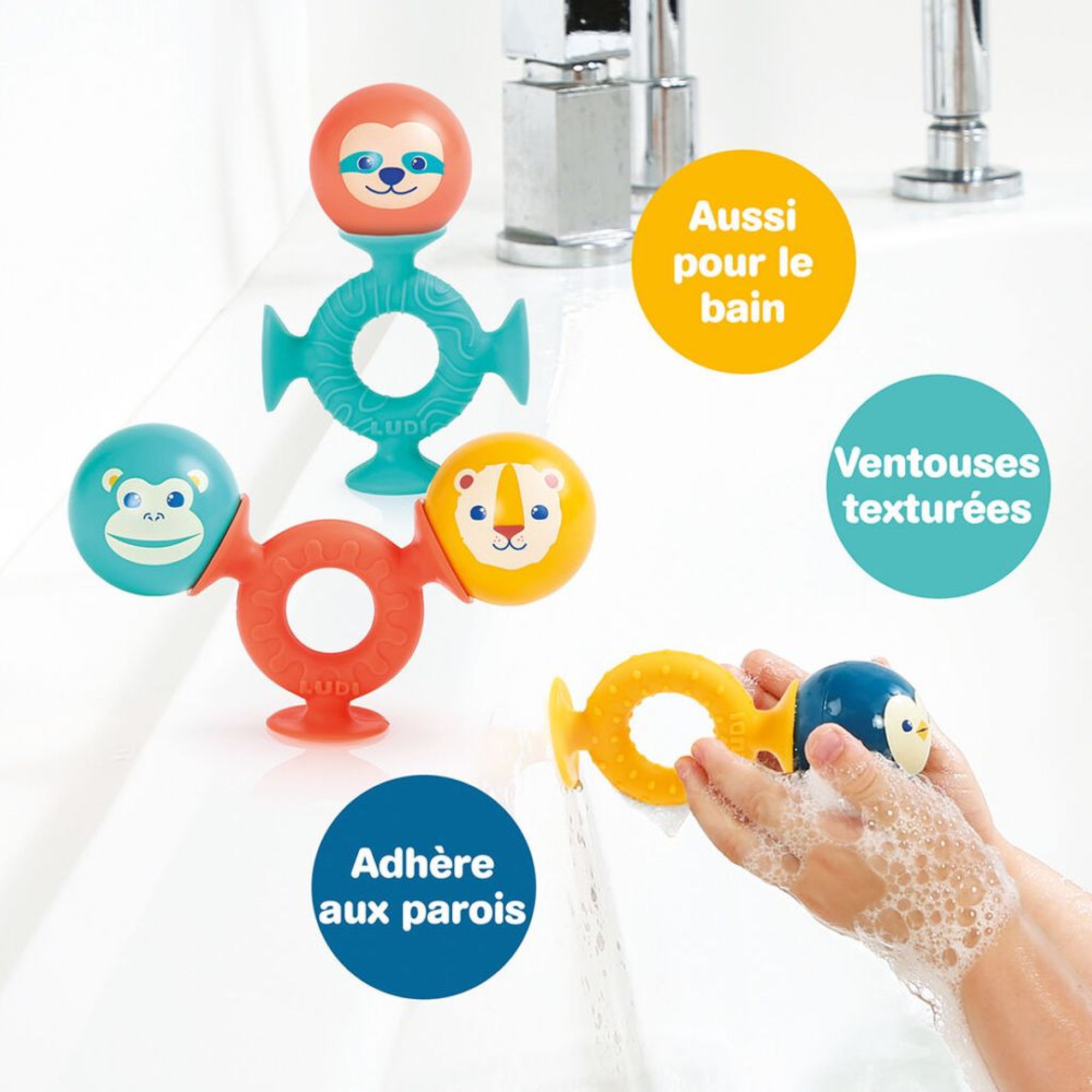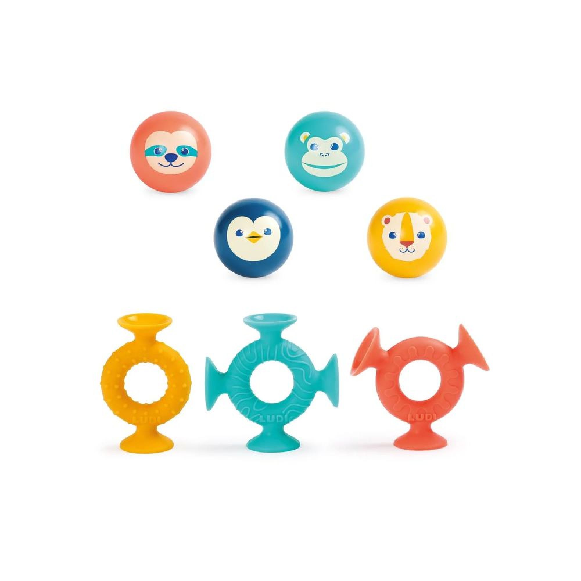 Ce jeu est composé de 4 balles sonores et 3 ventouses de formes différentes. Votre enfant s'amusera à créer pleins de formes originales différentes en associant les balles et les ventouses entre elles. Les ventouses permettent de fixer ce jeu sur n'importe quelle surface lisse.