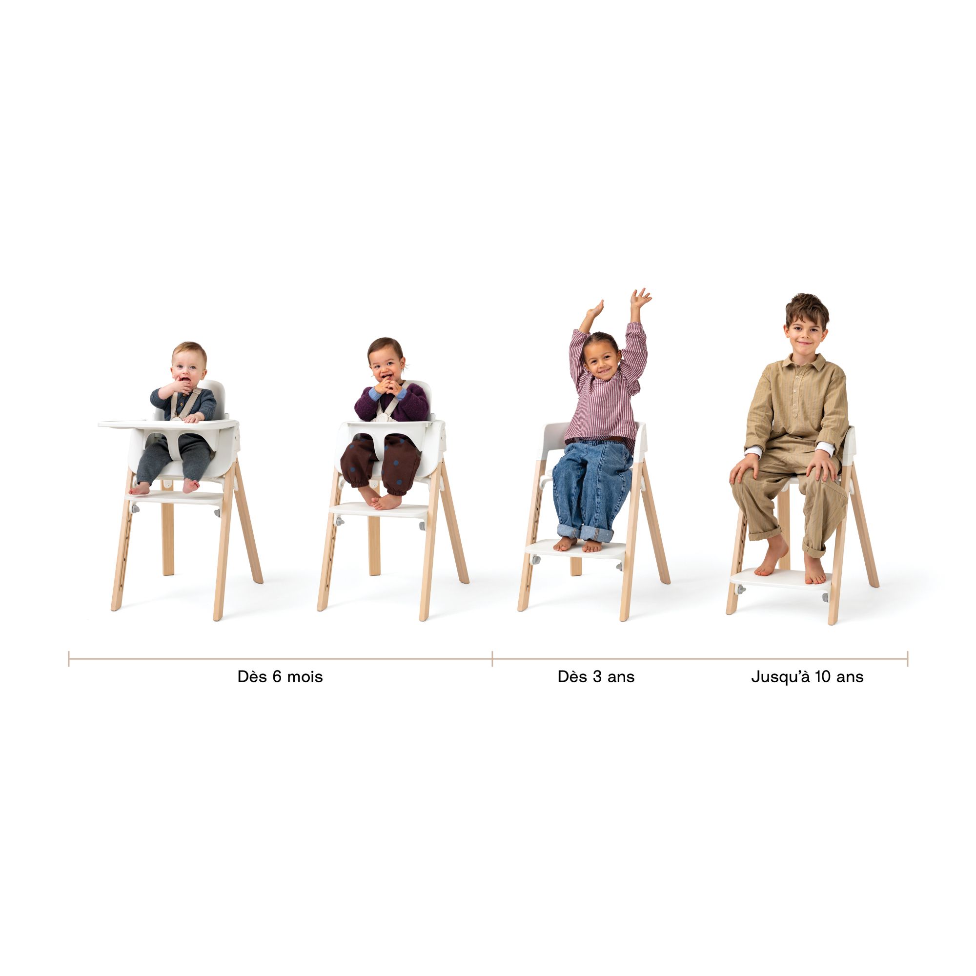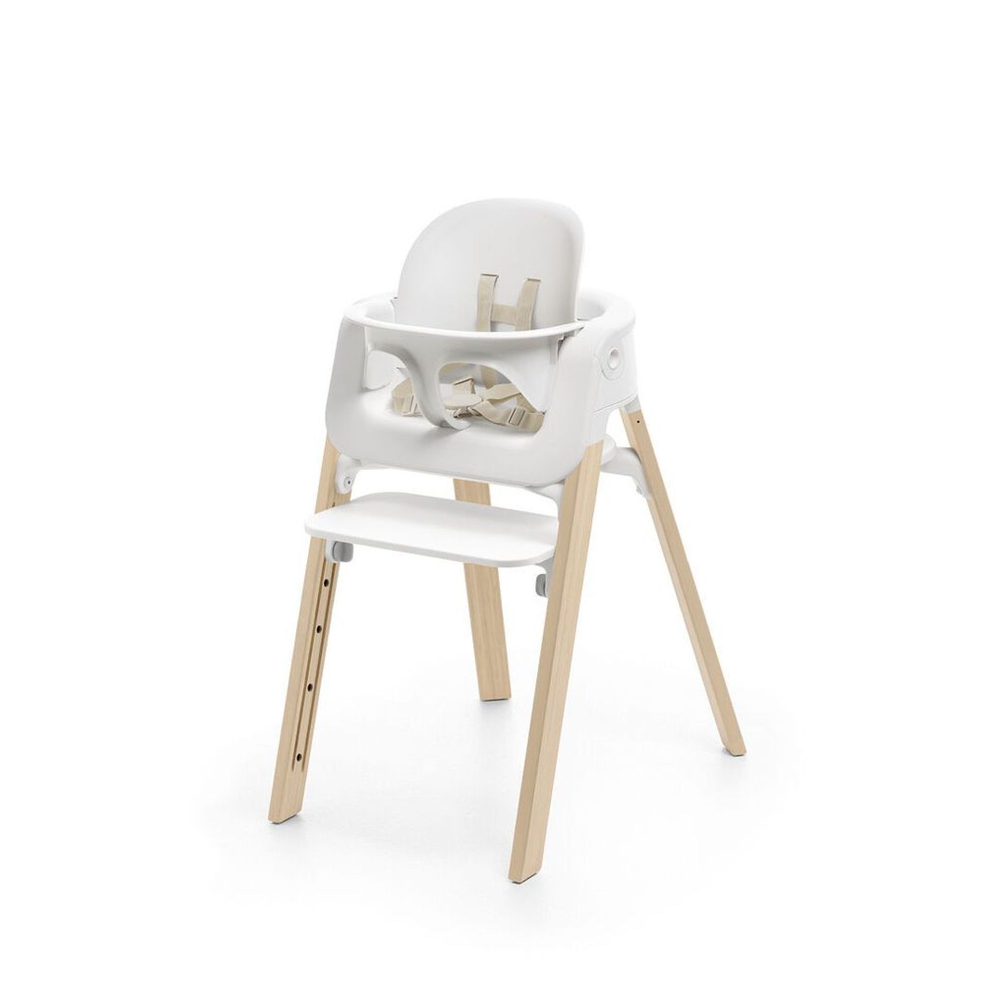 Craquez pour la chaise haute Steps complète avec baby set et plateau Blanc / natural de la marque Stokke. Cette chaise haute est livrée avec son baby set et son plateau repas qui sont amovibles. Cette chaise garantit un confort à votre enfant quel que soit son âge.
