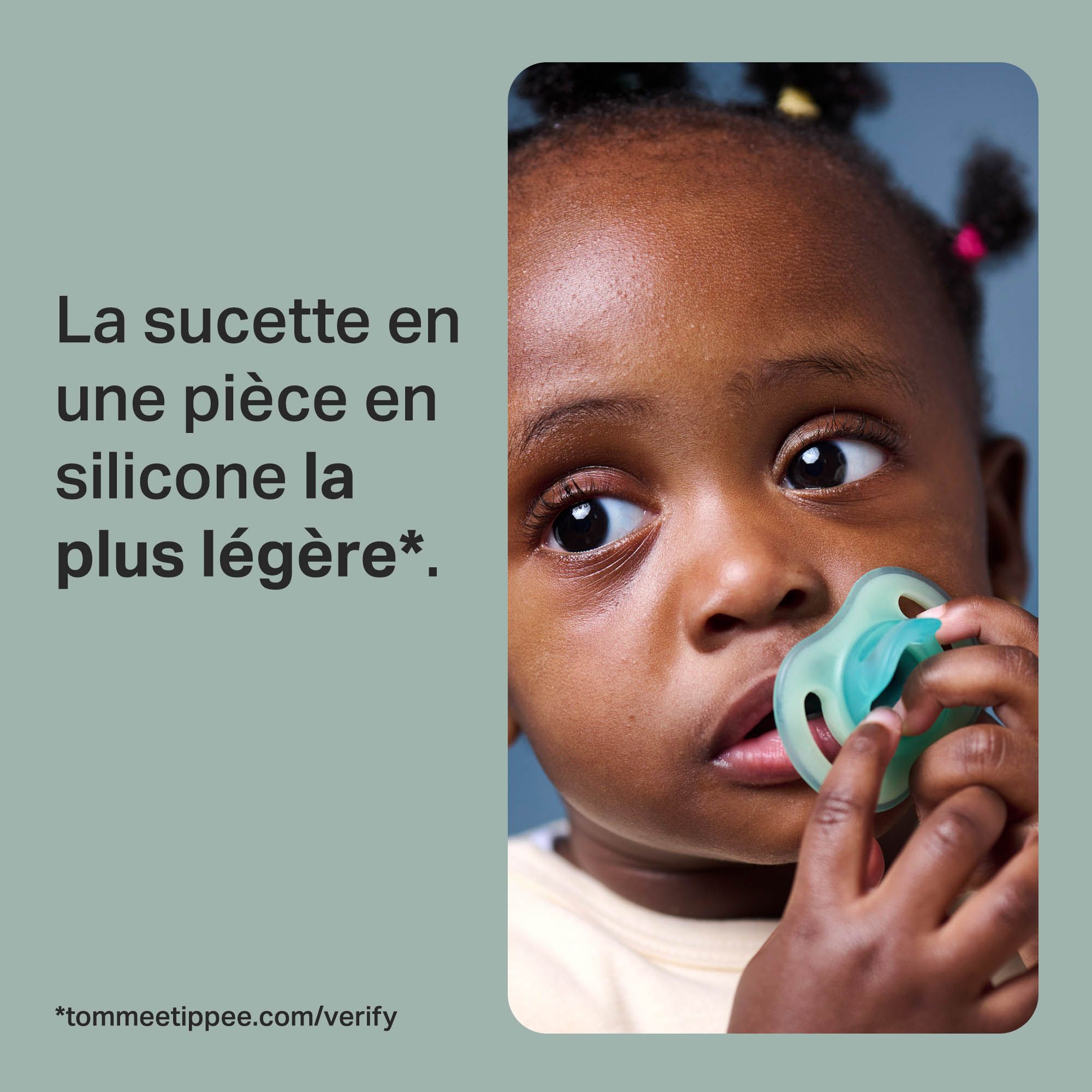 La forme symétrique de la sucette va permettre une meilleure circulation de l'air. Les sucettes de la marque Tommee Tippee sont garanties sans bisphénol A pour la santé de bébé. Facilite également le développement bucco-dentaire.
