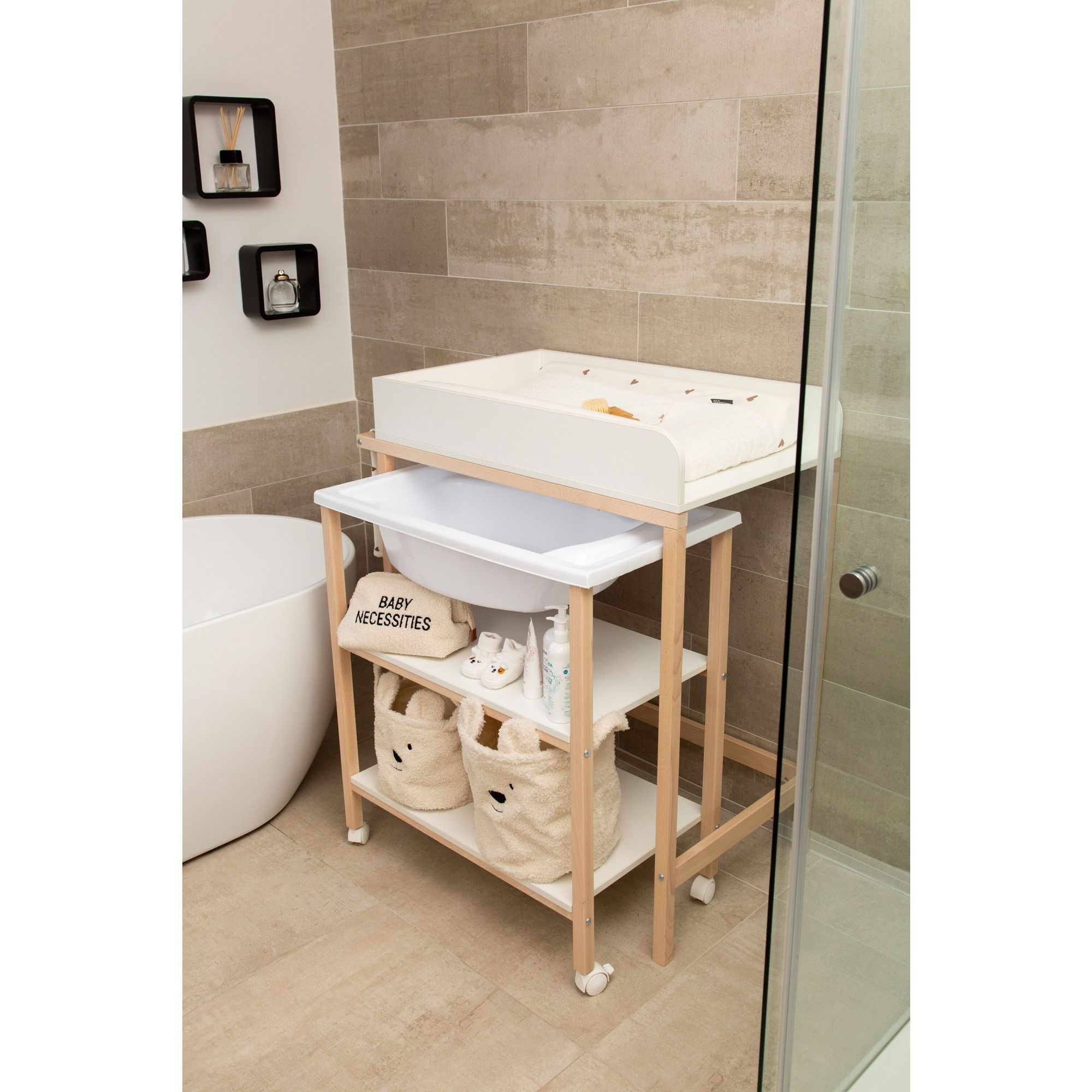 Découvrez la table à langer ave baignoire de la marque Childhome. Ce meuble ingénieux, 2-en-1, sera parfait pour votre salle de bain. Il possède une base fixe qui fait office de table à langer. En-dessous se trouve un meuble roulant avec une baignoire bébé intégrée ainsi que deux étagères coulissantes. Cette table à langer avec baignoire est adaptée pour un bain en toute sécurité.