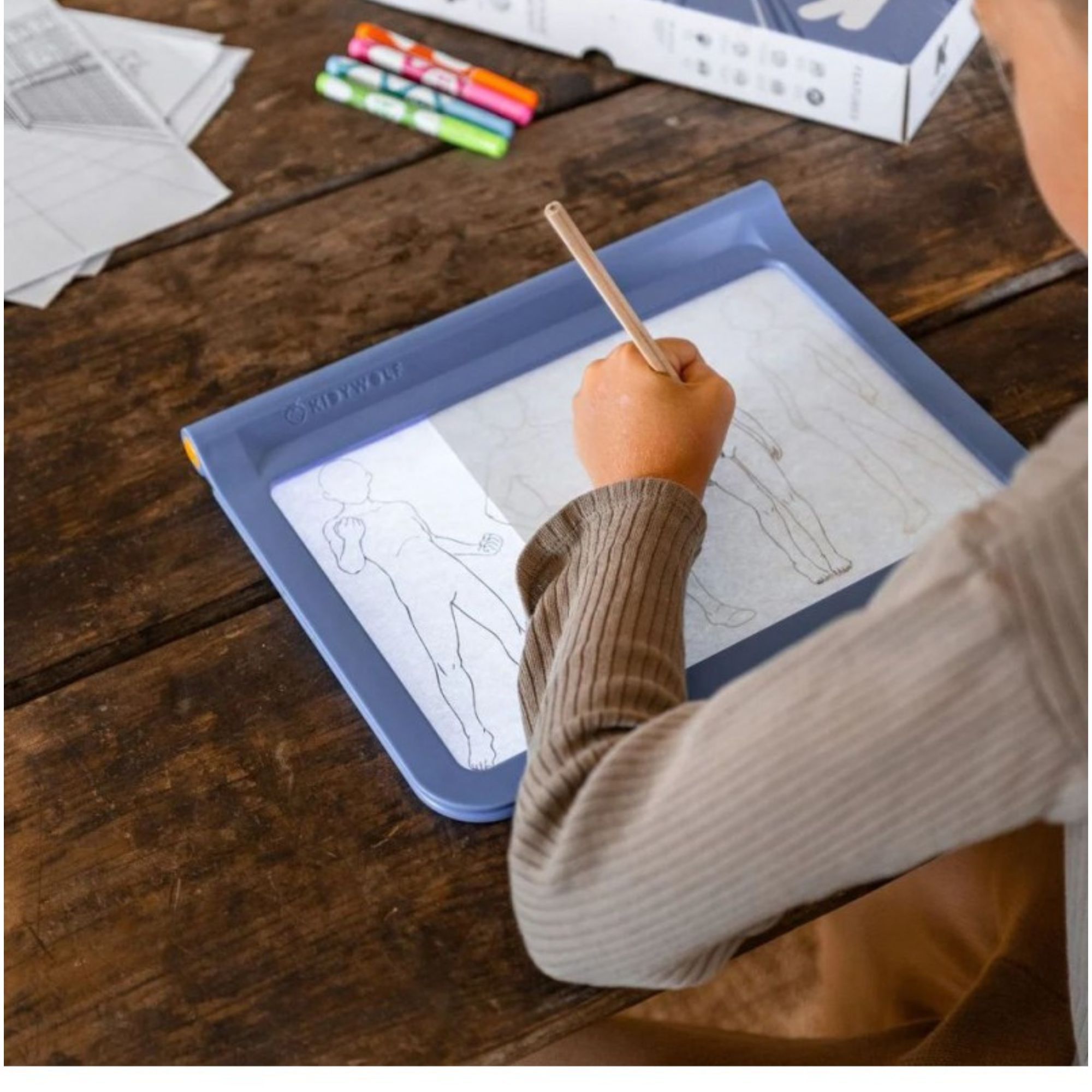 La face LED éclaire le dessin pour faciliter le décalquage ; la face néon amplifie les couleurs des marqueurs. Structure stable, patins antidérapants, batterie longue durée.