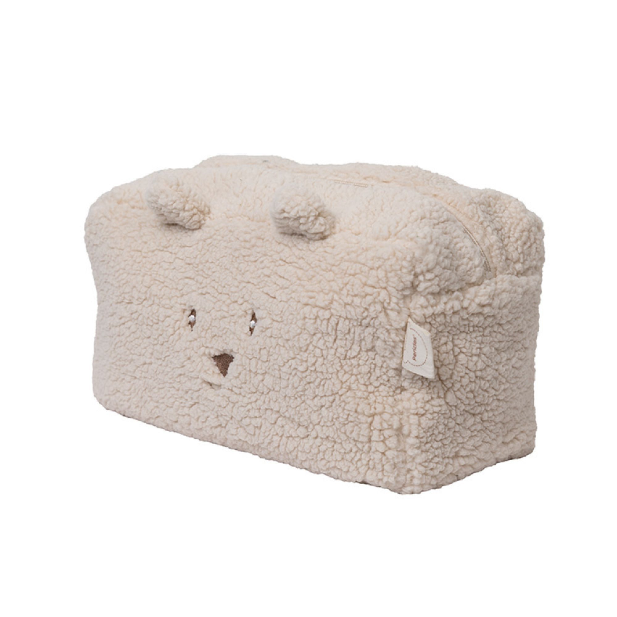Cette trousse de toilette est fabriquée dans un tissu teddy à la texture douce et réconfortante, idéal pour l'univers de votre bébé. L’intérieur est doté d’une doublure en polyester déperlant, qui protège contre l’humidité et facilite le nettoyage. Sa fermeture éclair robuste assure une ouverture et une fermeture simples et sécurisées. Grâce à son format léger et compact, elle s’emporte facilement dans un sac à langer ou une valise.