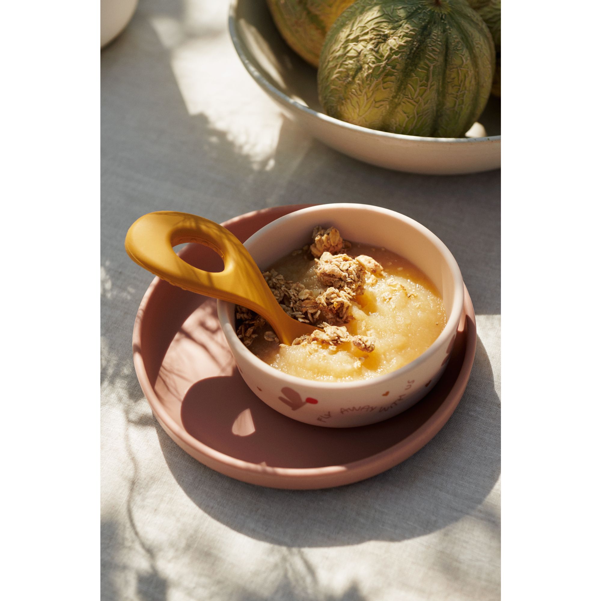 Conçu pour faciliter les repas des tout-petits, le coffret Vivi de la marque Liewood rassemble assiette, bol, tasse et cuillère adaptés aux petites mains et aux premières découvertes gustatives. Fabriqué en silicone 100% durable et doté de bords doux, il résiste aux chocs et offre un toucher agréable pour que bébé apprenne à manger seul en toute sécurité. La cuillère avec intérieur en nylon rigide assure une prise confortable pour les mains et la bouche de votre enfant. Léger, ergonomique et facile à nettoyer, ce coffret devient vite un indispensable du quotidien, à la maison comme en déplacement.