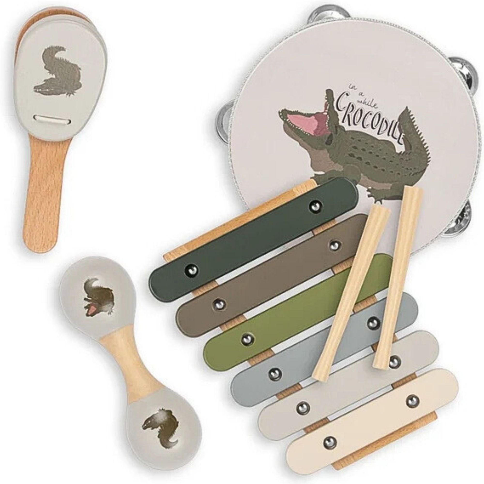 Matériaux : Xylophone : bois de hêtre / Baguettes : bois de pin / Castagnettes : bois de hêtre / Tambourin : contreplaqué / Maracas : bois de hêtre certifiés FSC™.